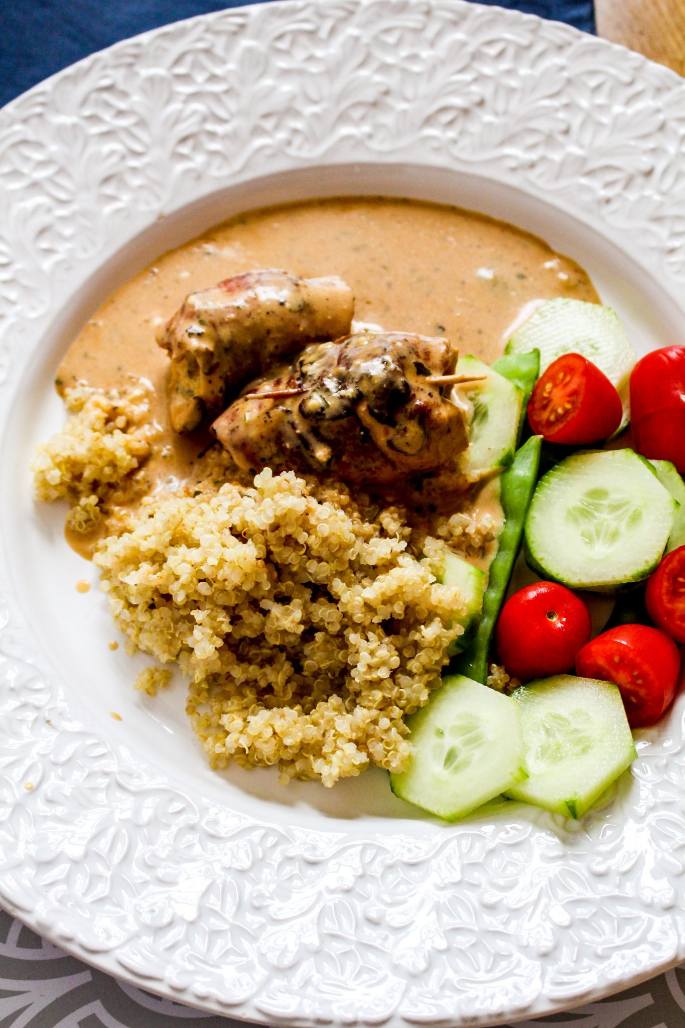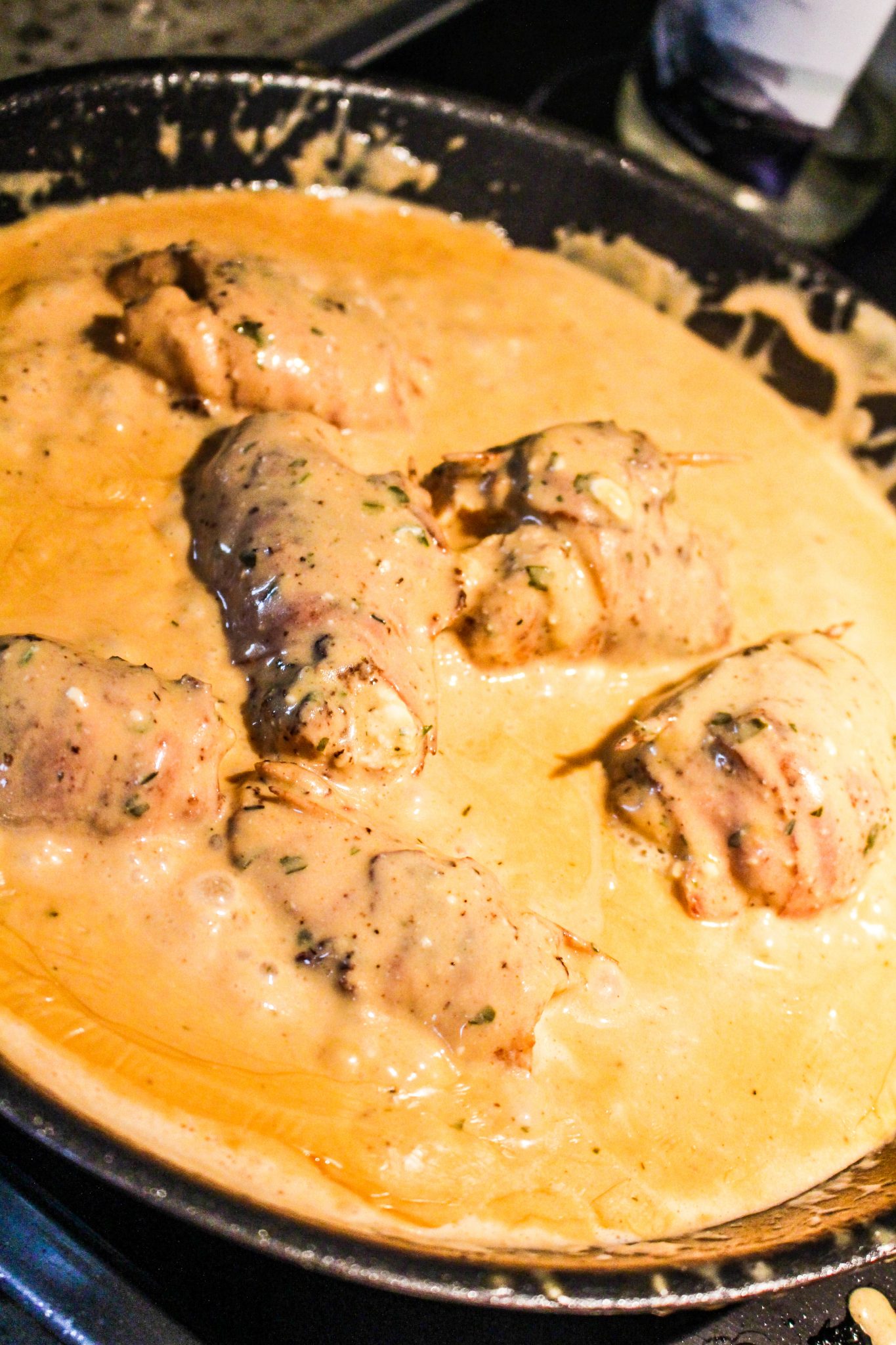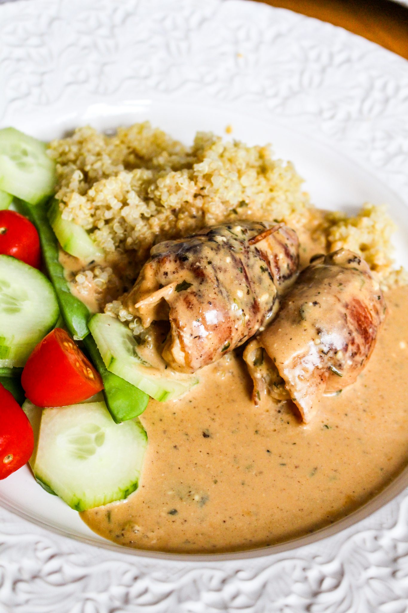 Jag hade inte tid att göra rullader, så jag stekte på kycklingbitar och bacon sen skickade jag i allt till röra med lite creme fraiche och grädde. Det blev gott det med.