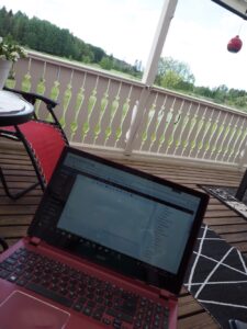 Åh hörni! Här njuter vi idag. Hemma hos mamma o pappa. Vi bara är…. Älskart! Milo struttar ute med fotbollen eller ligger på soffan, jag sitter och jobbar här i hörnet.