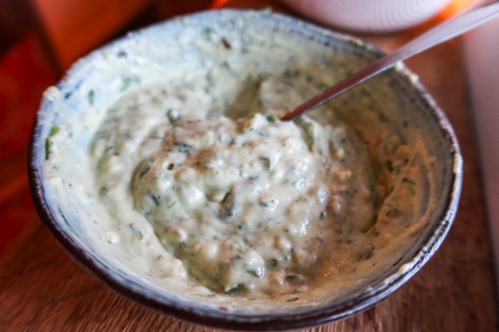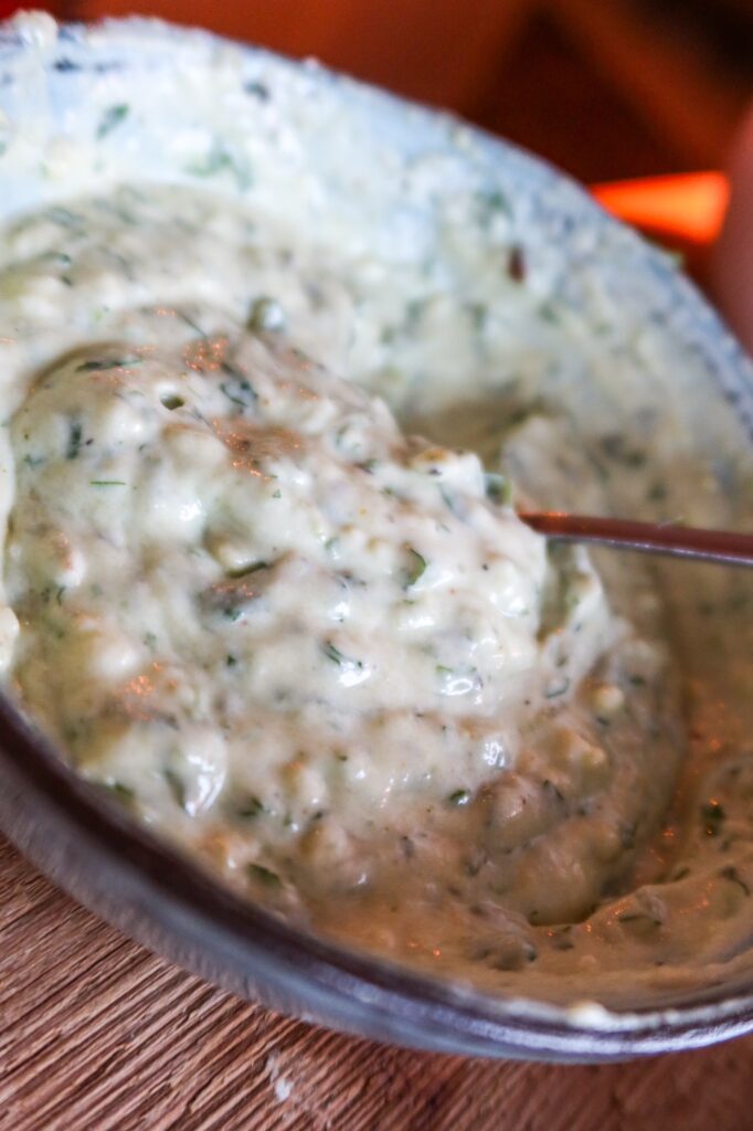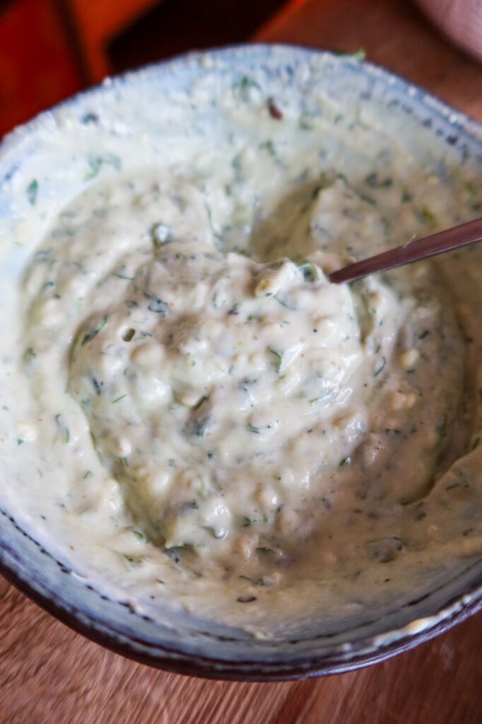 2) Pressa i vitlöken, hacka basilikan smått (du kan också köra den i matberedaren) och ha i den, pressa i citron, ha i honung, creme fraiche, chili flaket och salta & peppra efter smak.