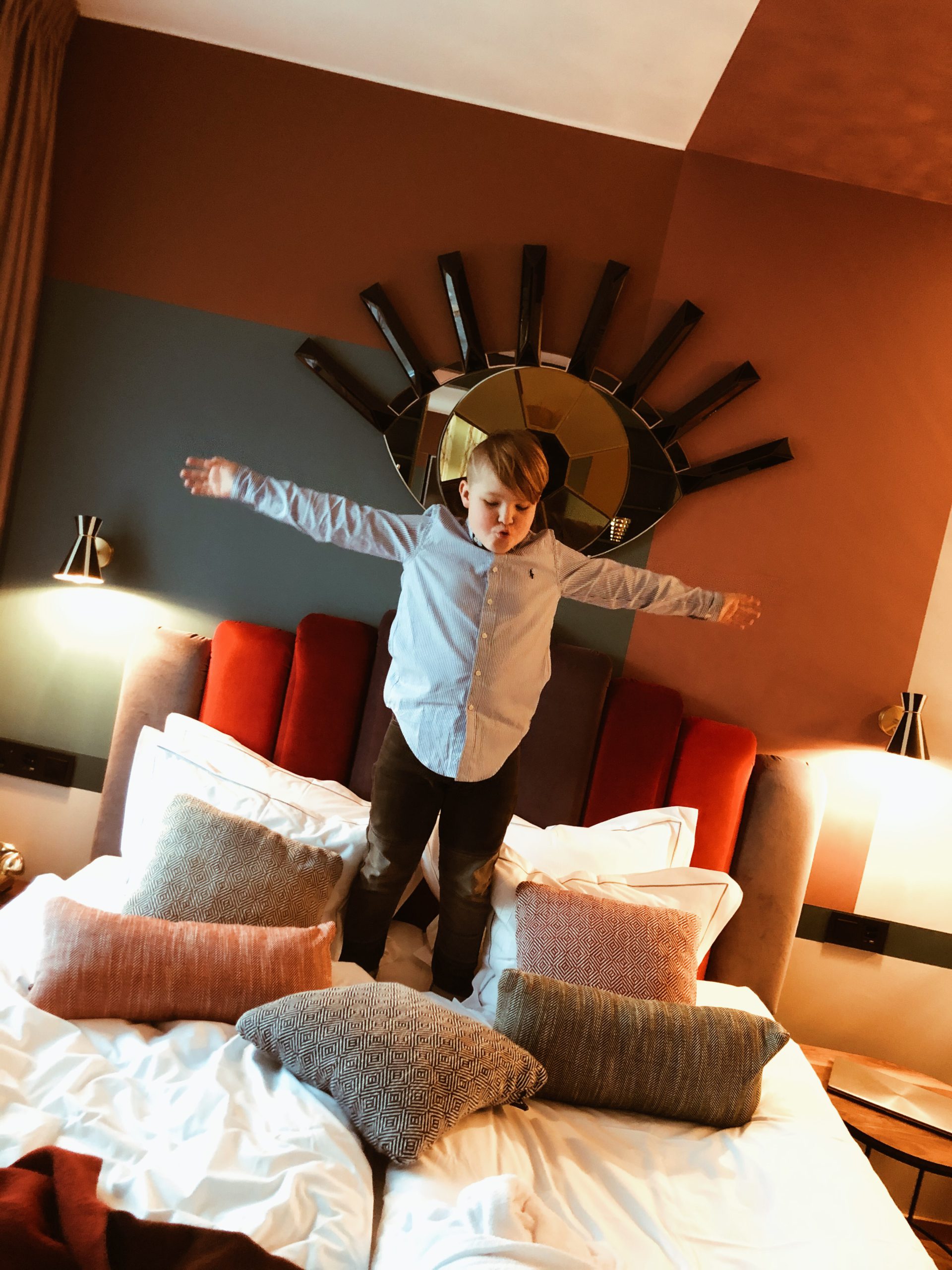 Superhärligt rum med badkar mottin rummet. Milo var lyrisk. Den gossen älskar att bo på hotell. Eller slott är ju detta faktiskt. Å ja, Milo visste vad den guldiga saken på nattygsbordet var. Har sett att vissa barn och ungdomar inte har en aning….. haha. Lite sött faktiskt.