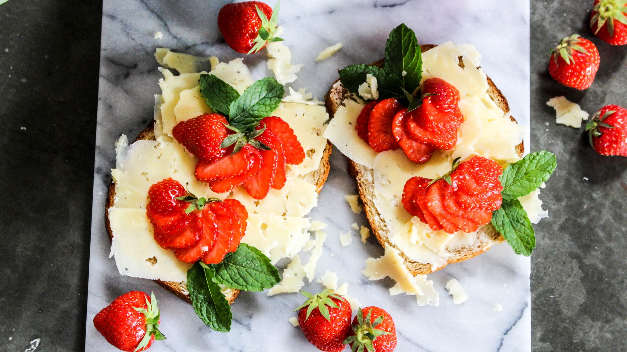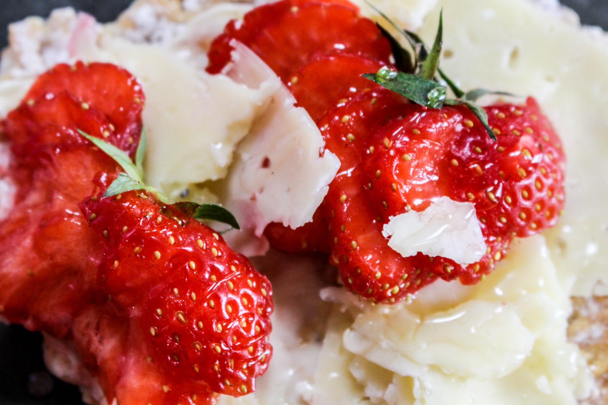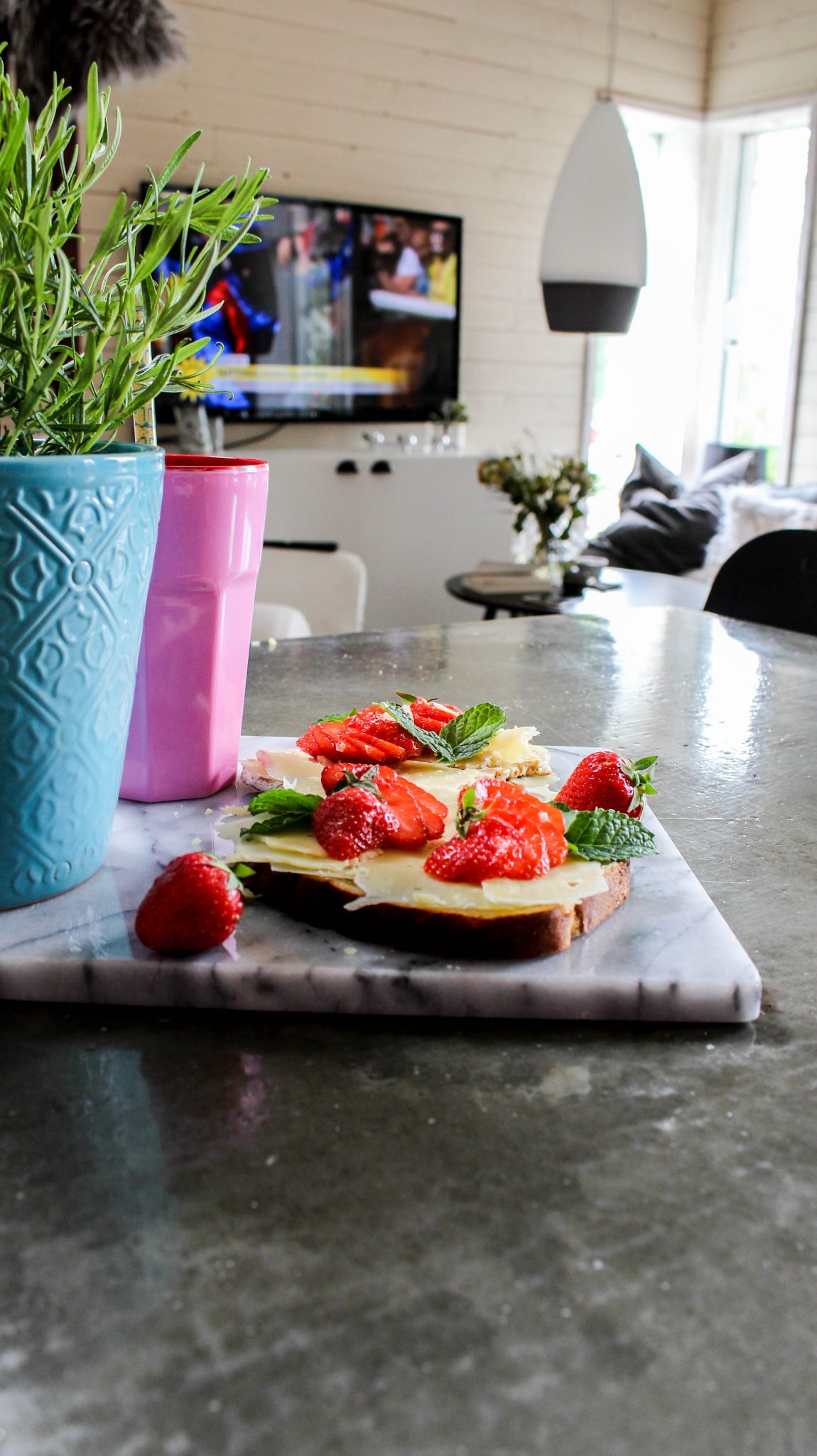 Frukostmackan gör du såhär. Ett gott bröd. Smör i botten, sedan skär du skivor av den här osten ( jag skär tills du skäms), slajsa några jordgubbar och sen ringlar du honung över alltsammans. Alltså, herre-min-jee så gott alltså. Till det avnjöt jag en stor kopp med koffeinfritt kaffe med havremjölk. MUMS!