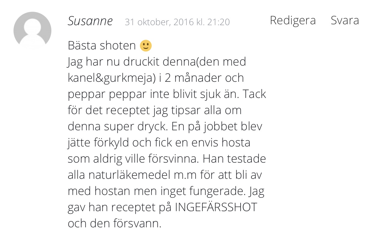 Det finns dom som druckit en shot varje morgon sen 5 år tillbaka och inte varit förkylda en endaste gång. En del säger att de inte dricker det på sommaren utan börjar i augusti och kör på till april typ. Det gör man som man vill…. Men det som verkar helt fantastiskt är ju att det verkar hålla förkylningar borta.