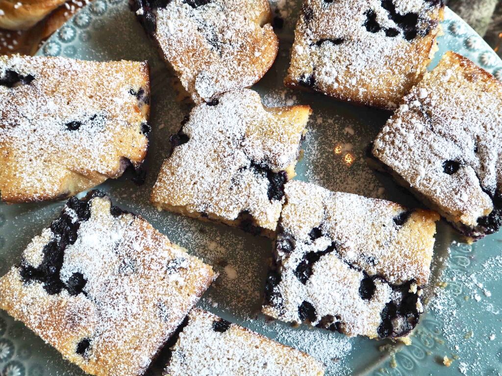 5) Klä en långpanna (ca 25×35 cm) med bakplåtspapper. Häll i hälften av smeten, sedan hälften av blåbären. Strö över hälften av rårörssockret också. Häll sedan på resten sv smeten, blåbären och rårörssockret.