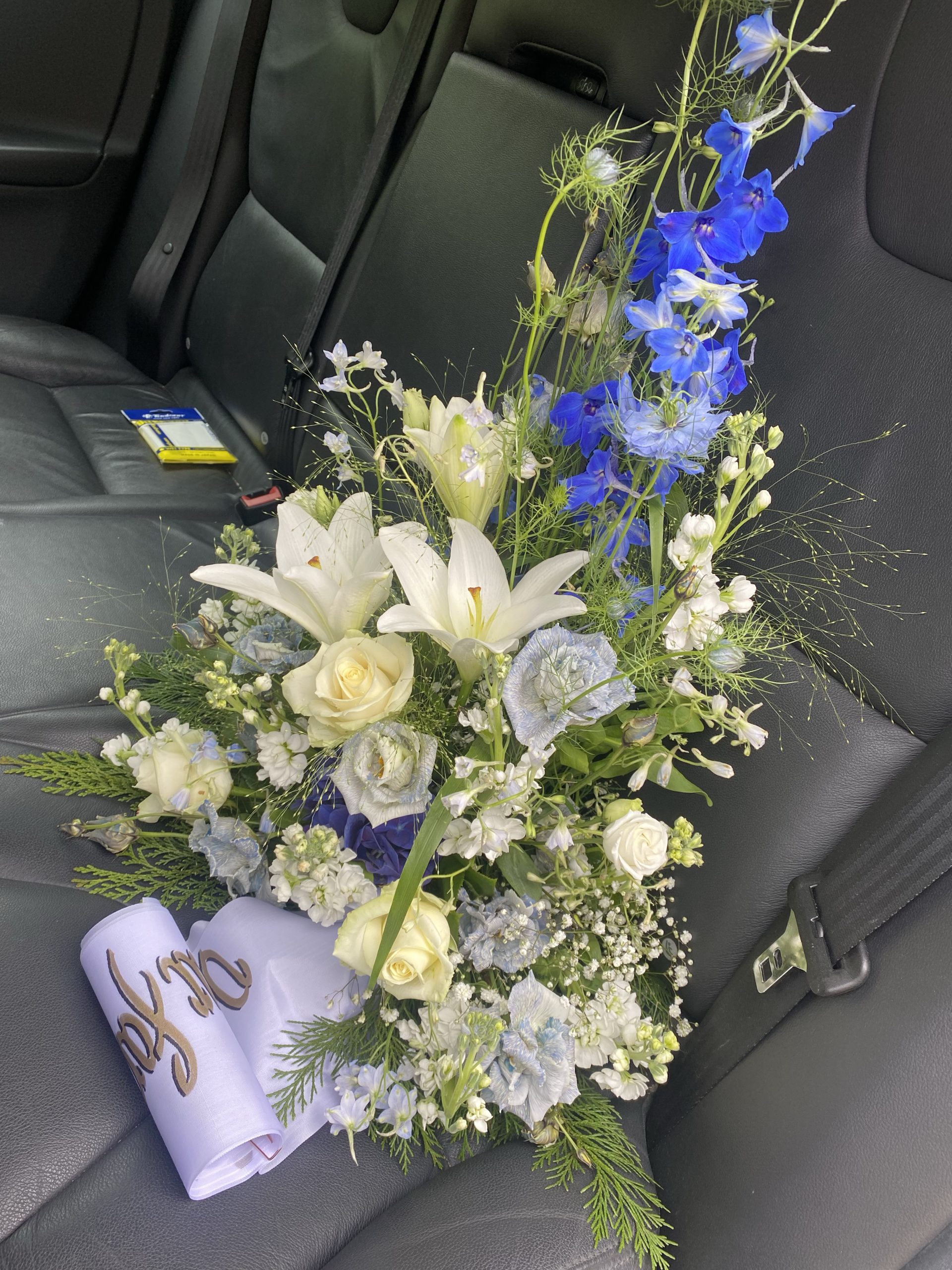 Vi valde att beställa på hemmaplan för att ta med dem själva. I vanliga fall beställer man ju i den staden begravningen ska vara på. Och i vanliga fall så kör Asplunds blommorna till kyrkan ja.