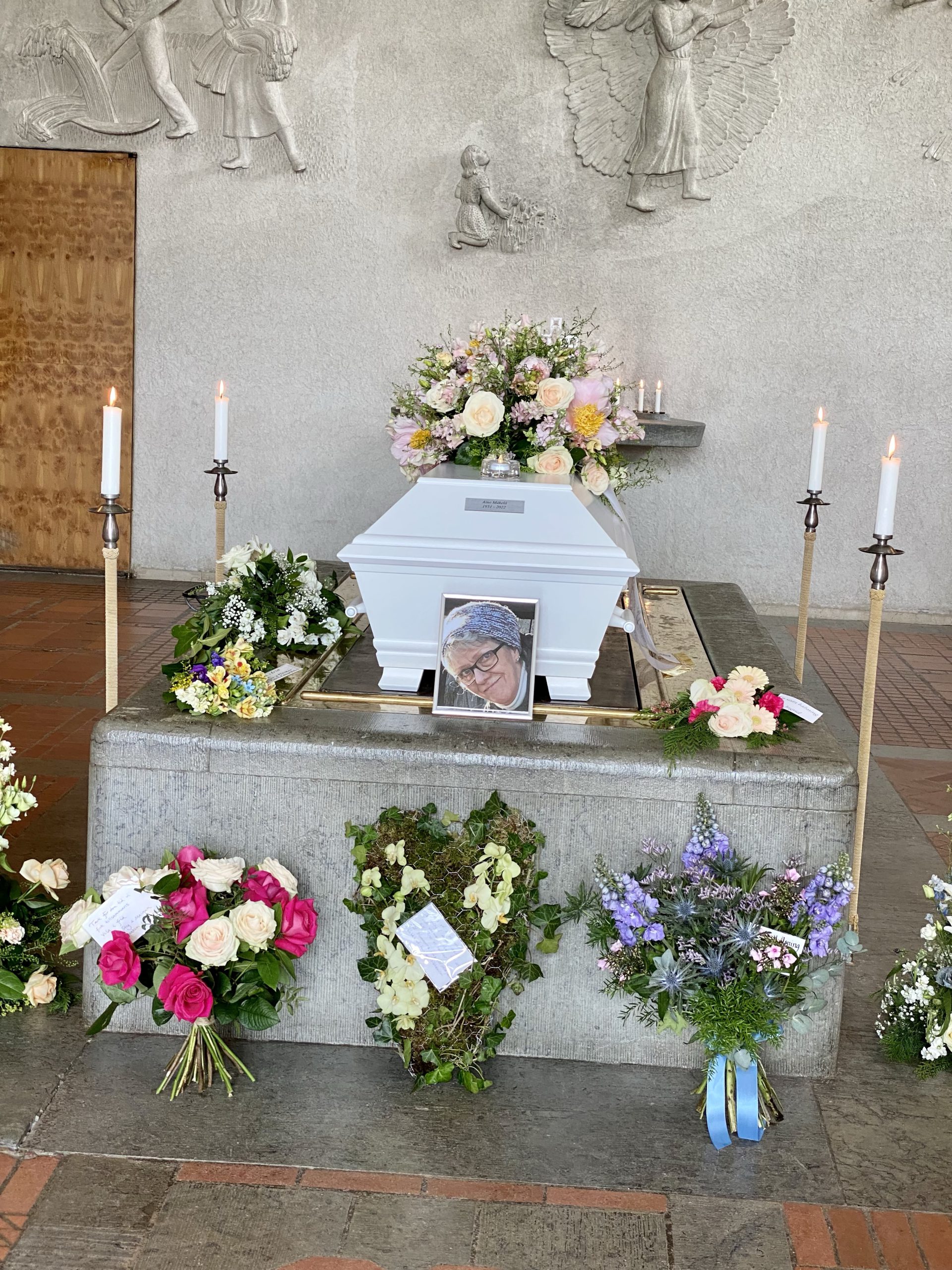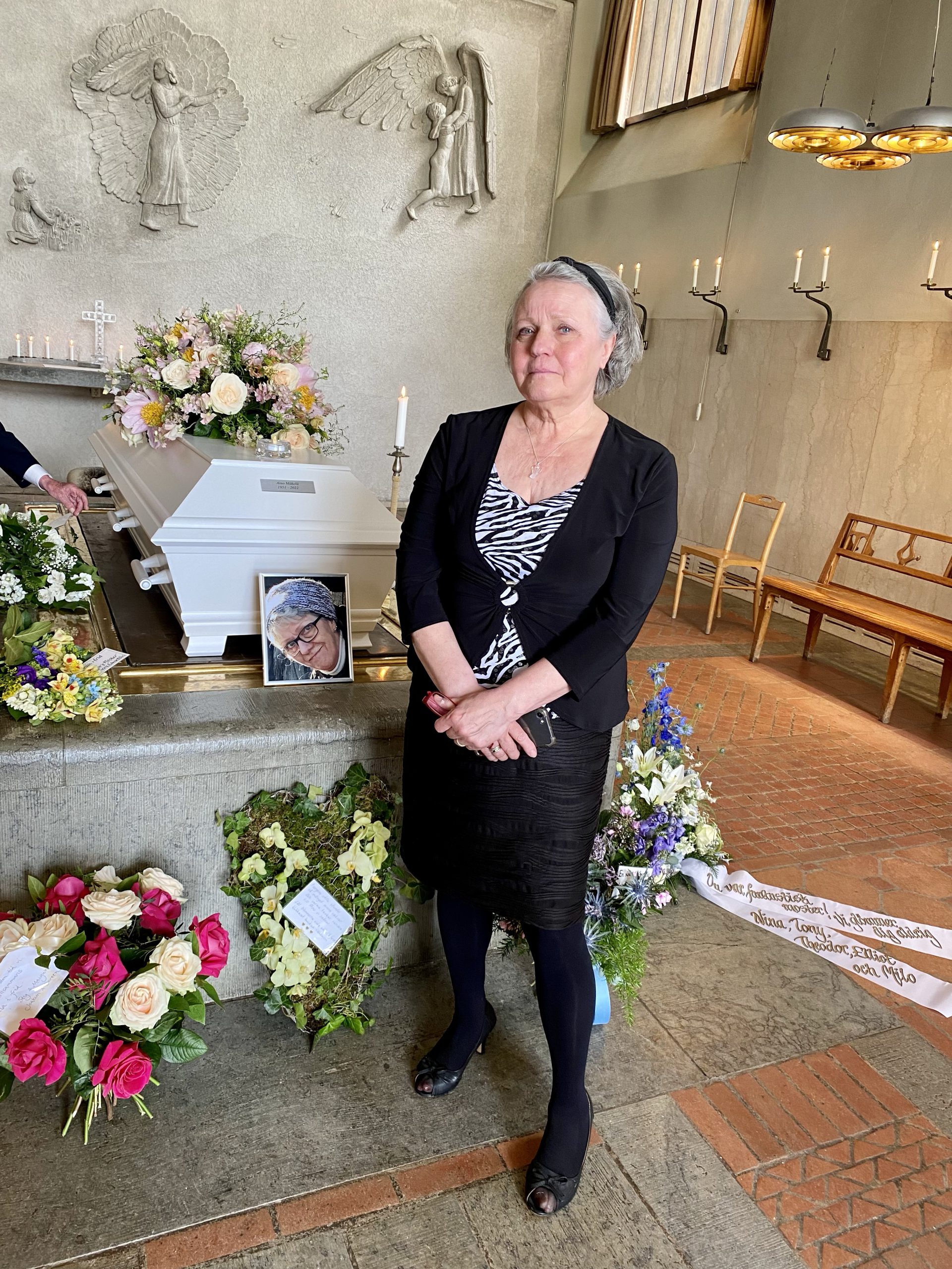 Min älskade fantastiska färgstarka temperamentsfulla moster, har så svårt att förstå att jag aldrig mer ska få träffa henne. Stundtals på begravningen kändes det som om hon skulle smälla upp dörren och bara: Vad håller ni pååååå meeeeed…. Hon saknades på sin egen begravning. Det fanns liksom ingen rim och reson i att hon inte var med oss. Satt bredvid oss.
