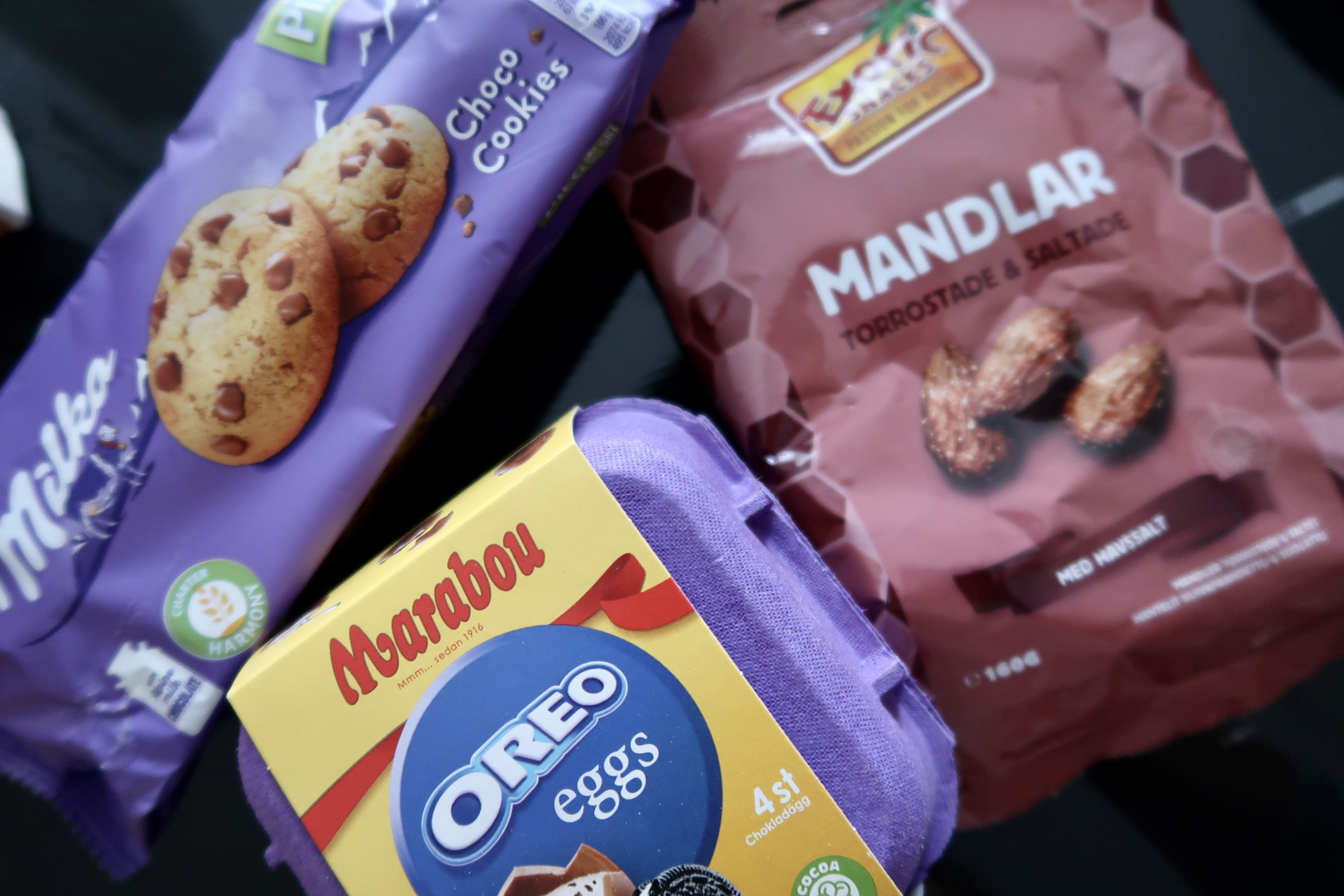 Milos favoriter från Milka, Choco Cookies och OREO ägg. Torrostade & saltade mandlar är sååå gott, tål ju mandlar lite dåligt men ibland kan jag inte låta bli. Får stå ut med lite kli…. 🙈