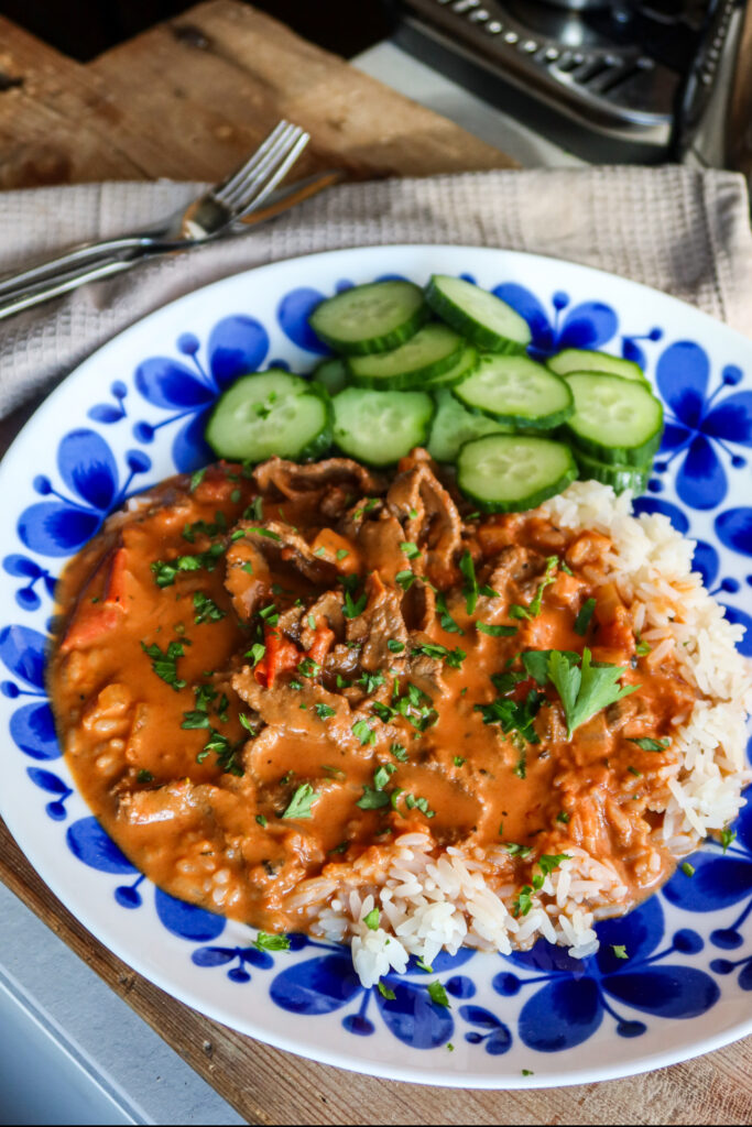 Jag har lagat biff stroganoff, och hörni, det blev superbra och gott detta. Tanken var att jag skulle göra det till en gryta först men medan jag lagade så tänkte jag att nej, jag testar det såhär istället. Och så blev det en biff stroganoff som familjen mumsat på i 2 dagar nu. Ja det räckte till matlådor också. Biff stroganoff kan du göra på olika kött, jag gjorde min på lövbiff men funkar såklart att göra det på ryggbiff i bit, innanlår eller nötbog i strimlor också. Tonåringen har ätit så det bara sagt slurp på tallriken, och då vet man att det är riktigt bra. Jag ”fyllde ut” min med krossade tomater och det blev förvånansvärt bra faktiskt, ja men testa vetja. Supersmaskigt till ris eller någon god potatis. Funkar till pasta också tycker jag.