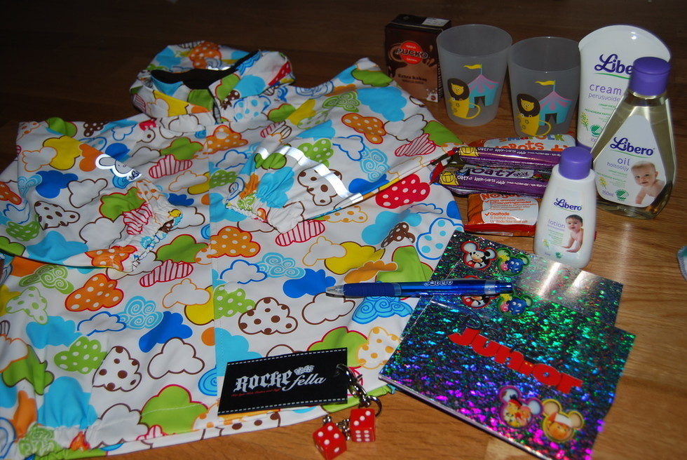 Oj oj oj, massa härliga produkter. T.o.m en regnjacka till Milo. Igår när jag satte mig för att gå igenom alla goodiebag påsar på vardagsrumsgolvet var det som julafton för tusan gubbar. Produkterna jag fick kom från Namnsmycken, Jollyroom, Rockefella, Miss Dee m.m.