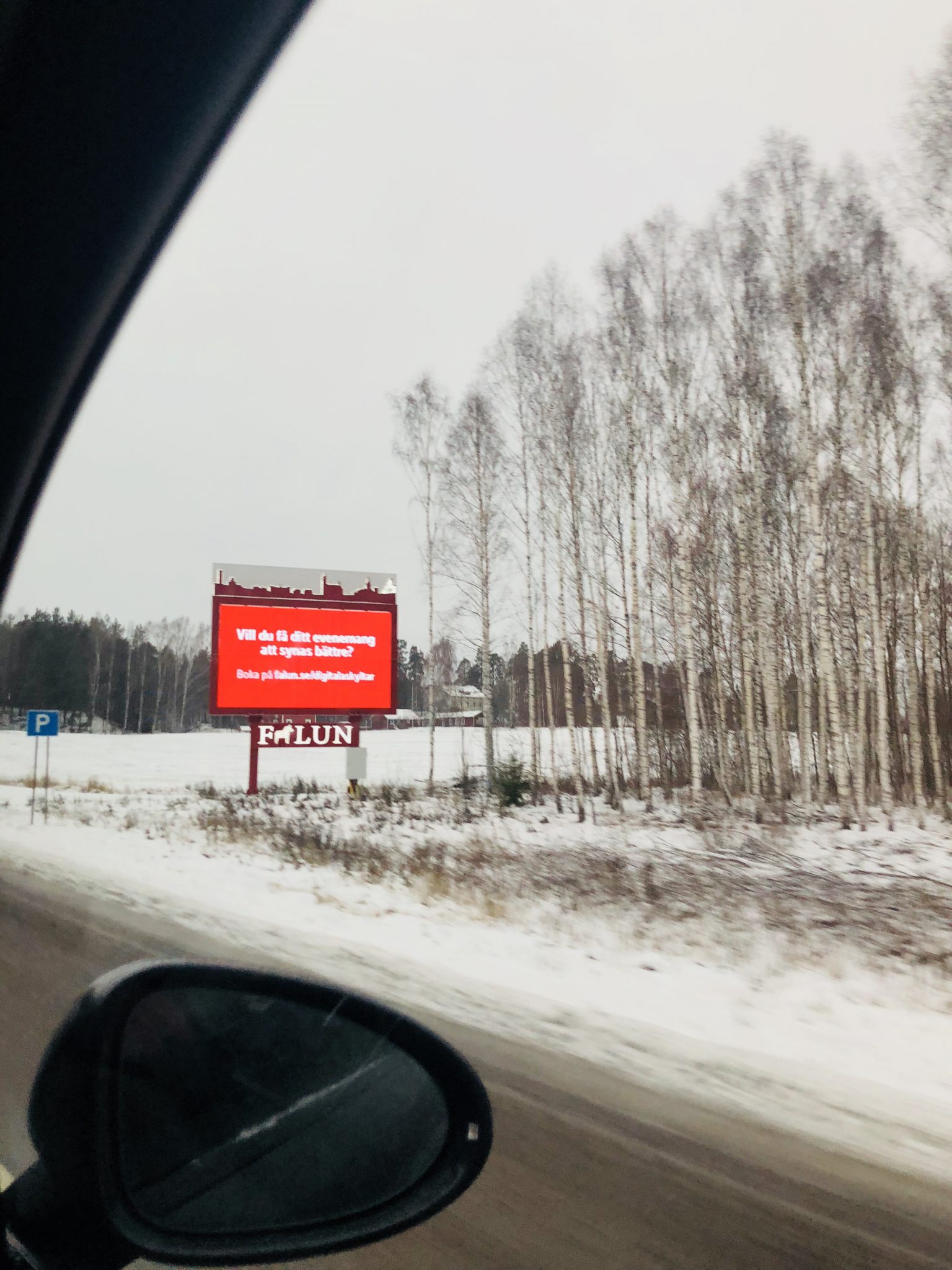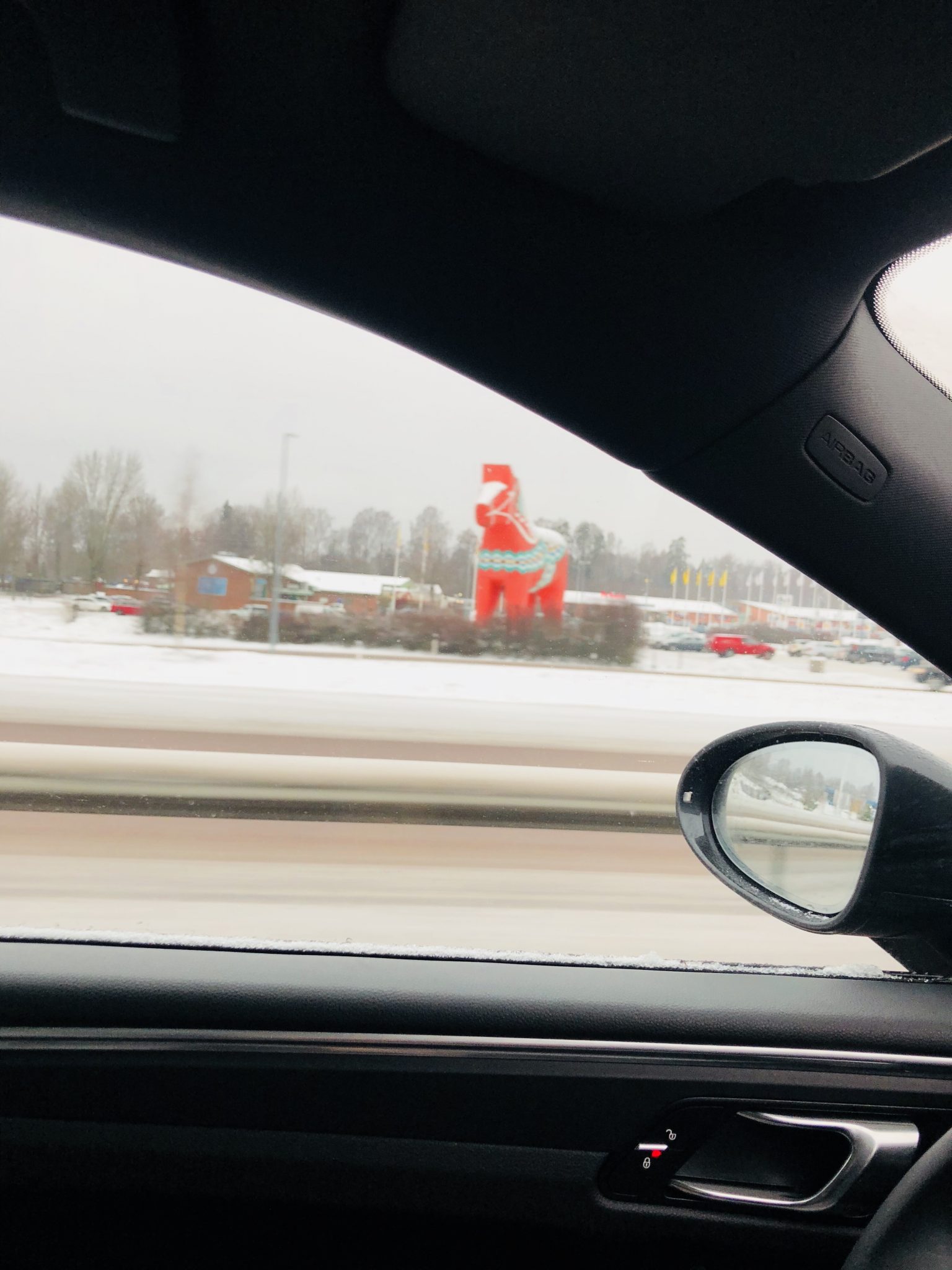 Vägen hit i bilder. Alltid en bild på dalahästen såklart. Vet inte hur många bilder jag har på den där hästfan? Haha…. Den är ju symbolen för att man kommer till dalarna och inbringar så mycket lycka så jag tror nog många gör lika. Slutligen passerade vi Falun med hoppbacken och allt. Bjursås där vi bor ligger bara ca 15 km från Falun.