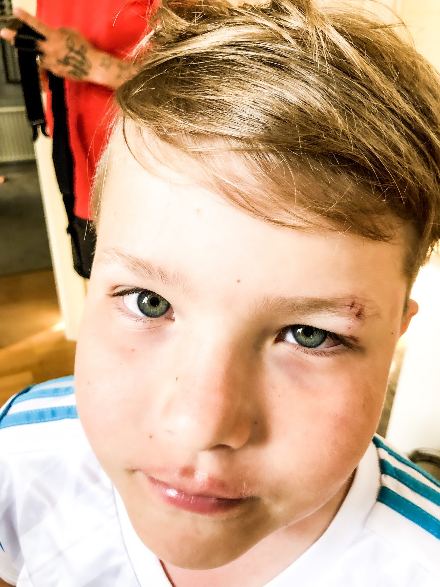 Kolla in vår lille solstråle då? Ämen idag hade det varit oturens dag på idrottsdagen. Inte nog med att han ramlade ned för ett par trappor och skrapade upp hela benet? Nä, han sprang in i en stolpe också och slog i ögonbrynet. Där kommer det nog bli en blåtira nu. Tufflen!