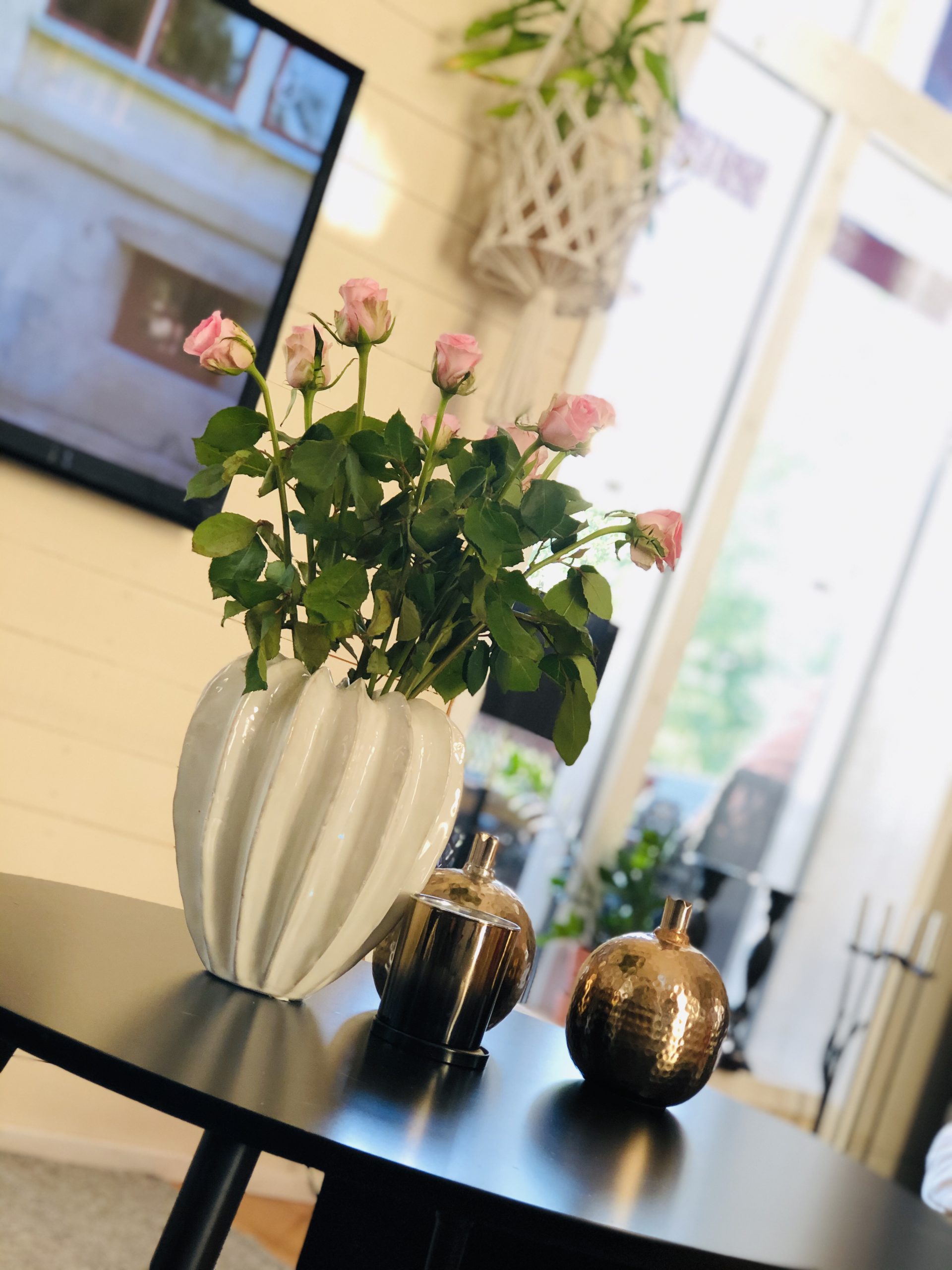 Har legat här i soffhörnet och beundrat mina rosor. Småslokar lite men är såå fina ändå. Rosa rosor är min grej numera, så himla fiiiiint.