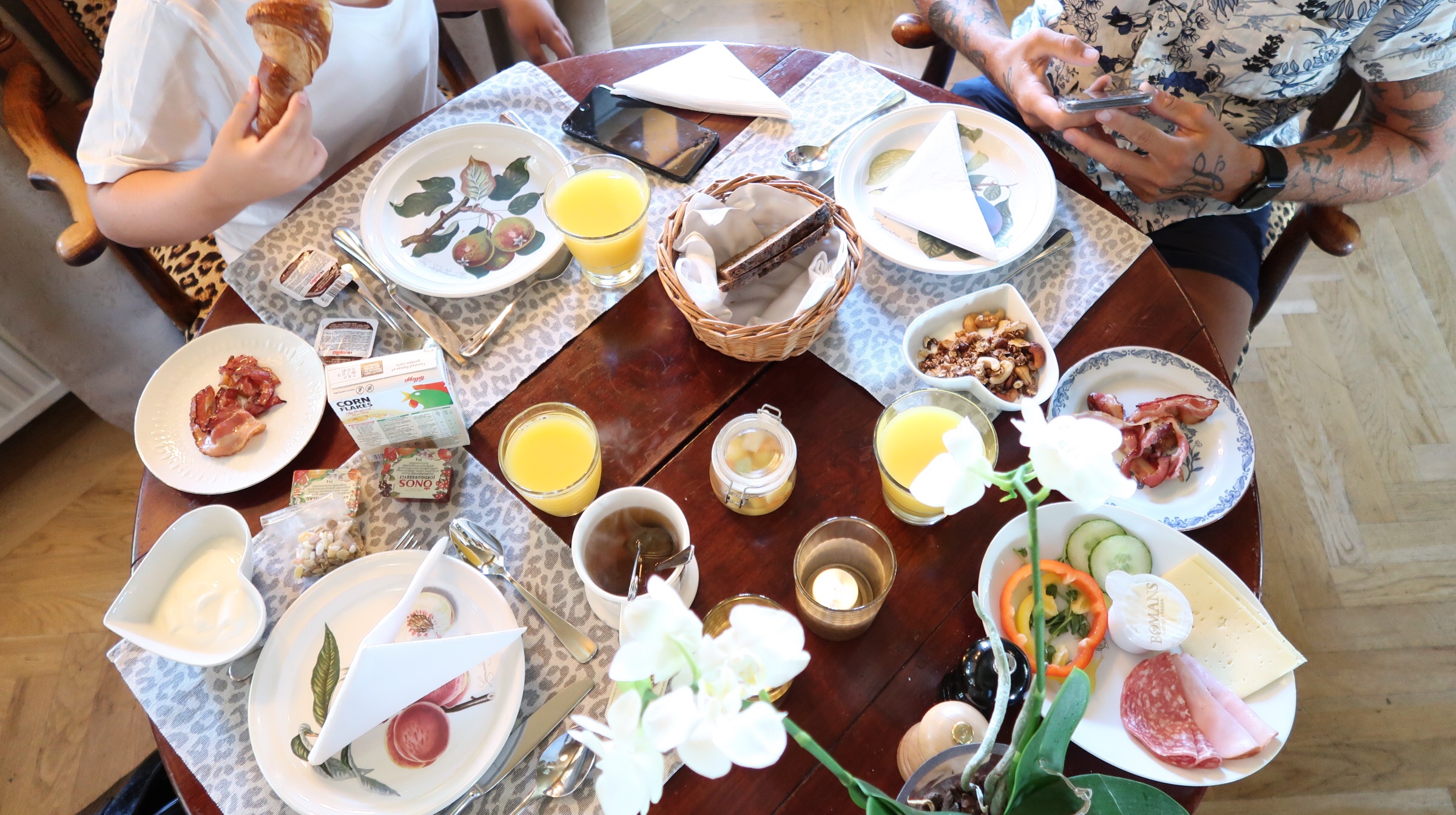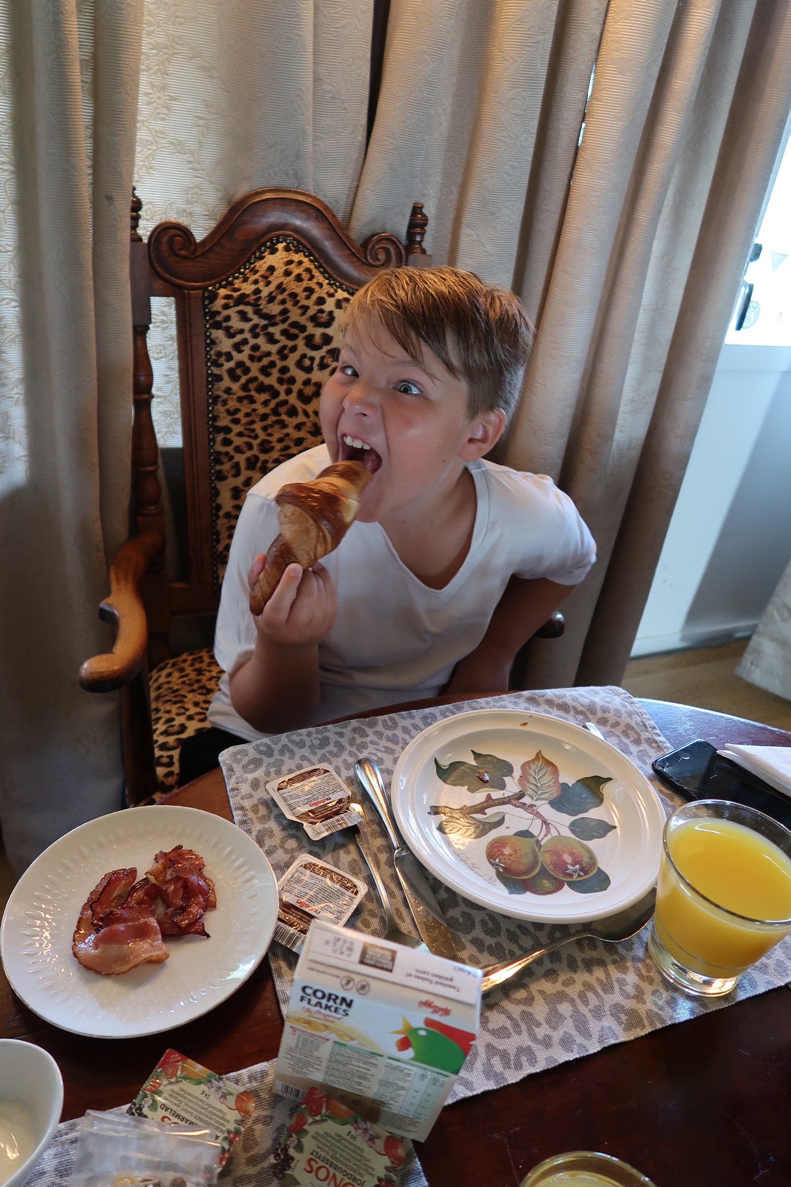På morgonen startade jag och Milo med ett bad. Alla ville såklart testa badkaret mitt i rummet. Sen var det frukost! Där fanns de största croissanterna jag någonsin sett! Vi satt länge där också och åt så vi rullade ut därifrån!