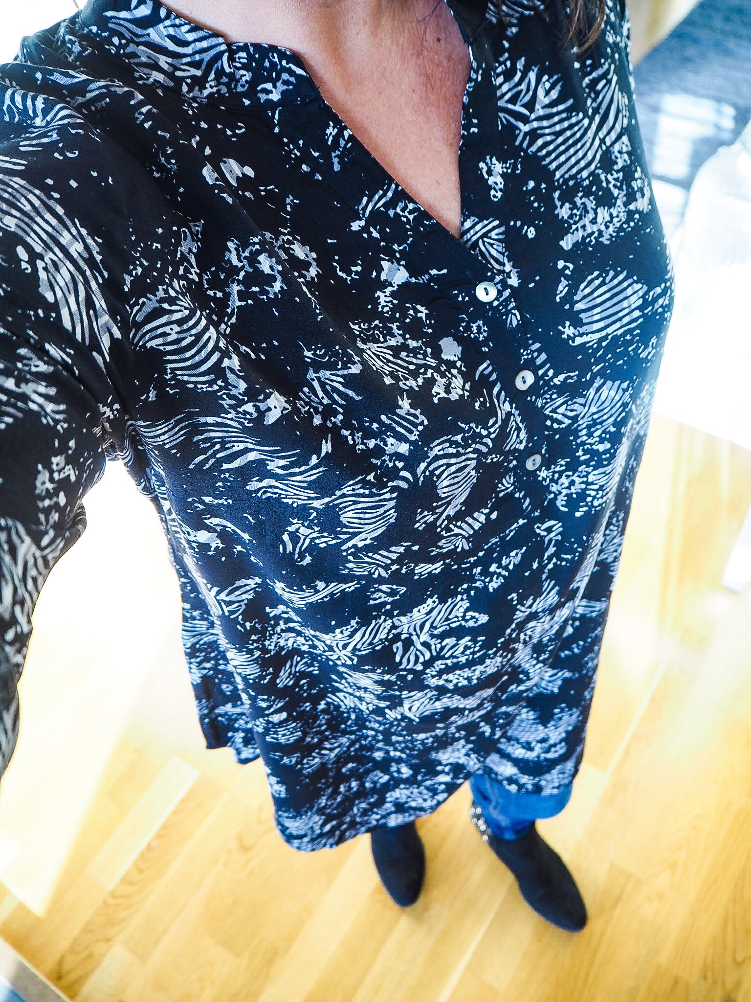 Jag ääääälskar i alla fall båda. Långskjorta måste ju vara det skönaste plagget i världshistorien?! Ingen mage som syns, löst, slappt, skönt, avslappnat och ledigt. Just den här har lite finare ärmar som man kan vika upp. Gillar mönstret som påminner lite om en karta med zebramönster. Snyggt till tajta brallor och klackar.
