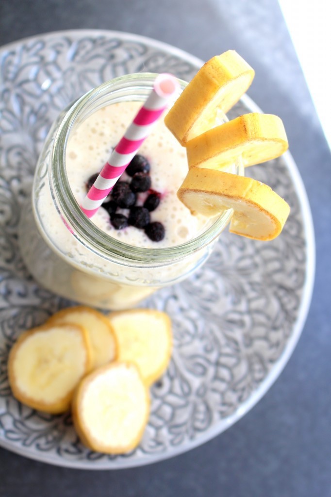 Antingen så slänger du i allt (allt utom blåbären och de skivade bananerna) i en blender och låter det stå och köra i en minut. Eller så mixar du med en handmixer tills du har en helt slät smoothie. Häll upp i ett trevigt glas, toppa med några blåbär och skivan bananskivor så skalet är kvar på och sätt fast på kanten. Sug i dig och njut! ♥