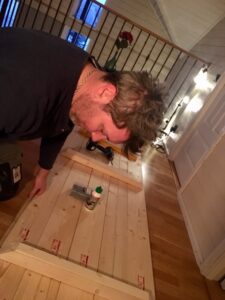 Vi började med att köpa reglar att ha som plank till bordsskivan. Dom finns på byggvaruhus och i olika storlekar. Reglarna sågas i lika långa bitar, vi behövde inte såga alls då vi valde en längd på reglarna som skulle passa som ett bord hos oss. Under har vi smalare reglar som man sätter fast alla plankor i. Tänk på att ha tillräckligt långa skruvar. Vi limmade också för att få det extra stabilt.