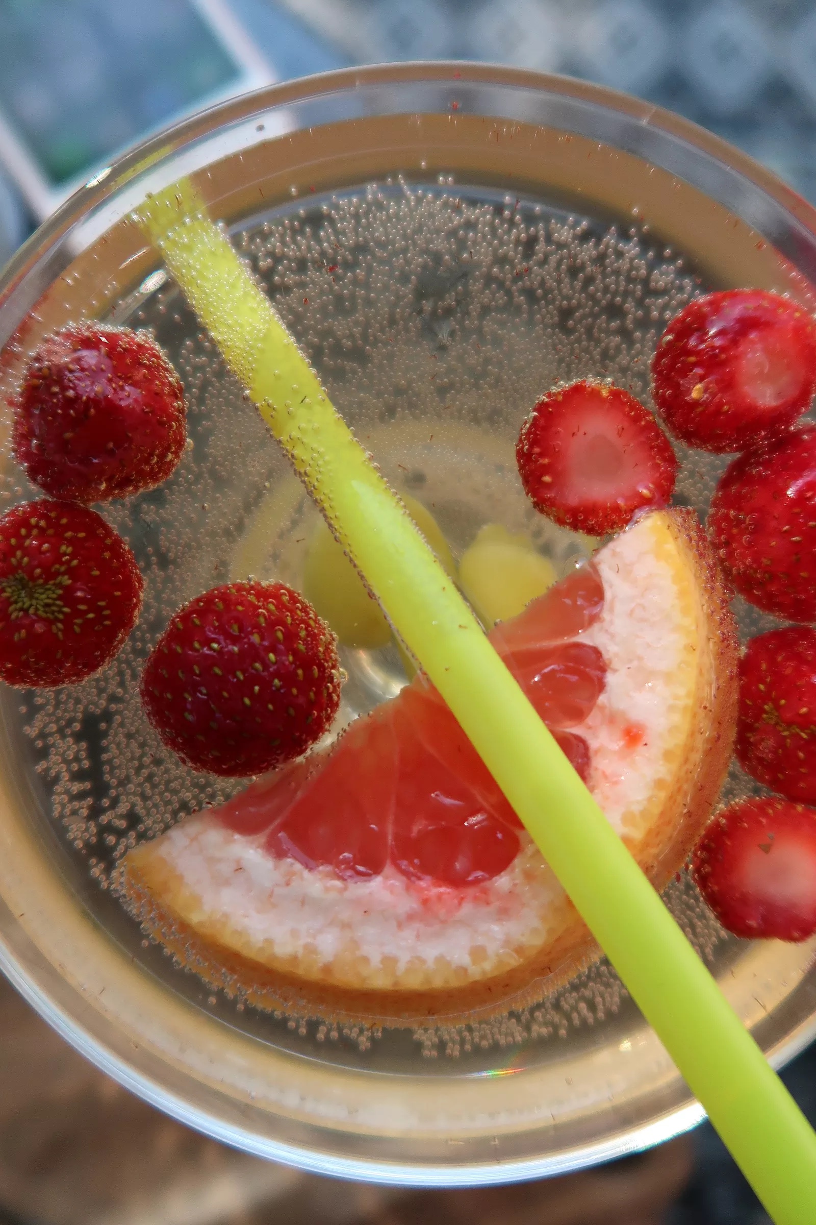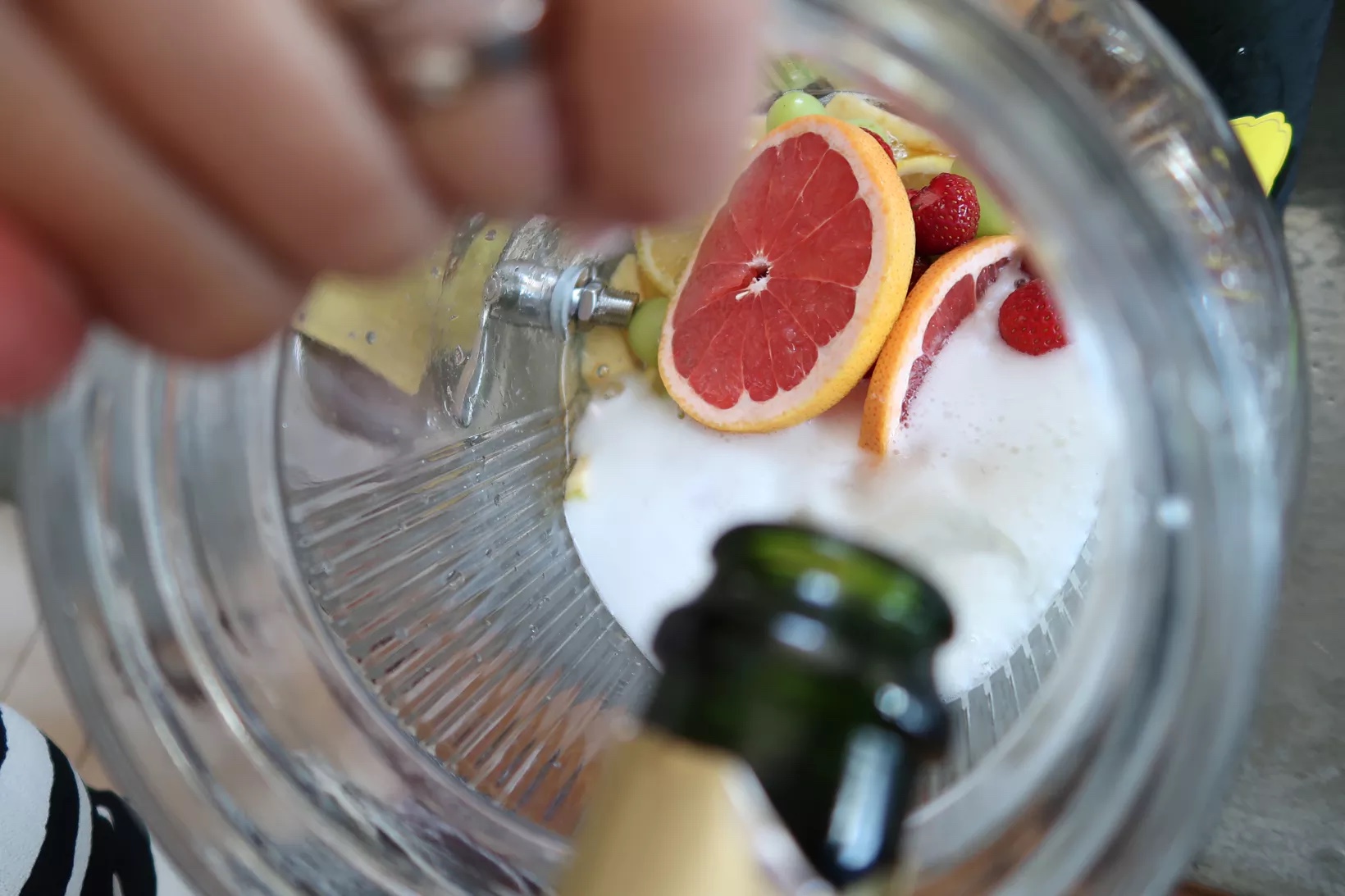 2) Skiva blodgrape och citron och lägg i botten på en behållare. Ha i frysta vindruvor och jordgubbar. Häll i all Cava och Sprite och ställ den kallt tills den ska serveras.