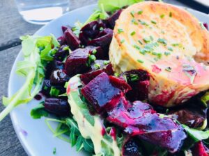 Något att bjuda på till förrätt på nyårsafton skulle kunna vara chèvre och rödbetssallad. Antingen små sallader på små assietter, eller så gör man en stor som alla får plocka ifrån.