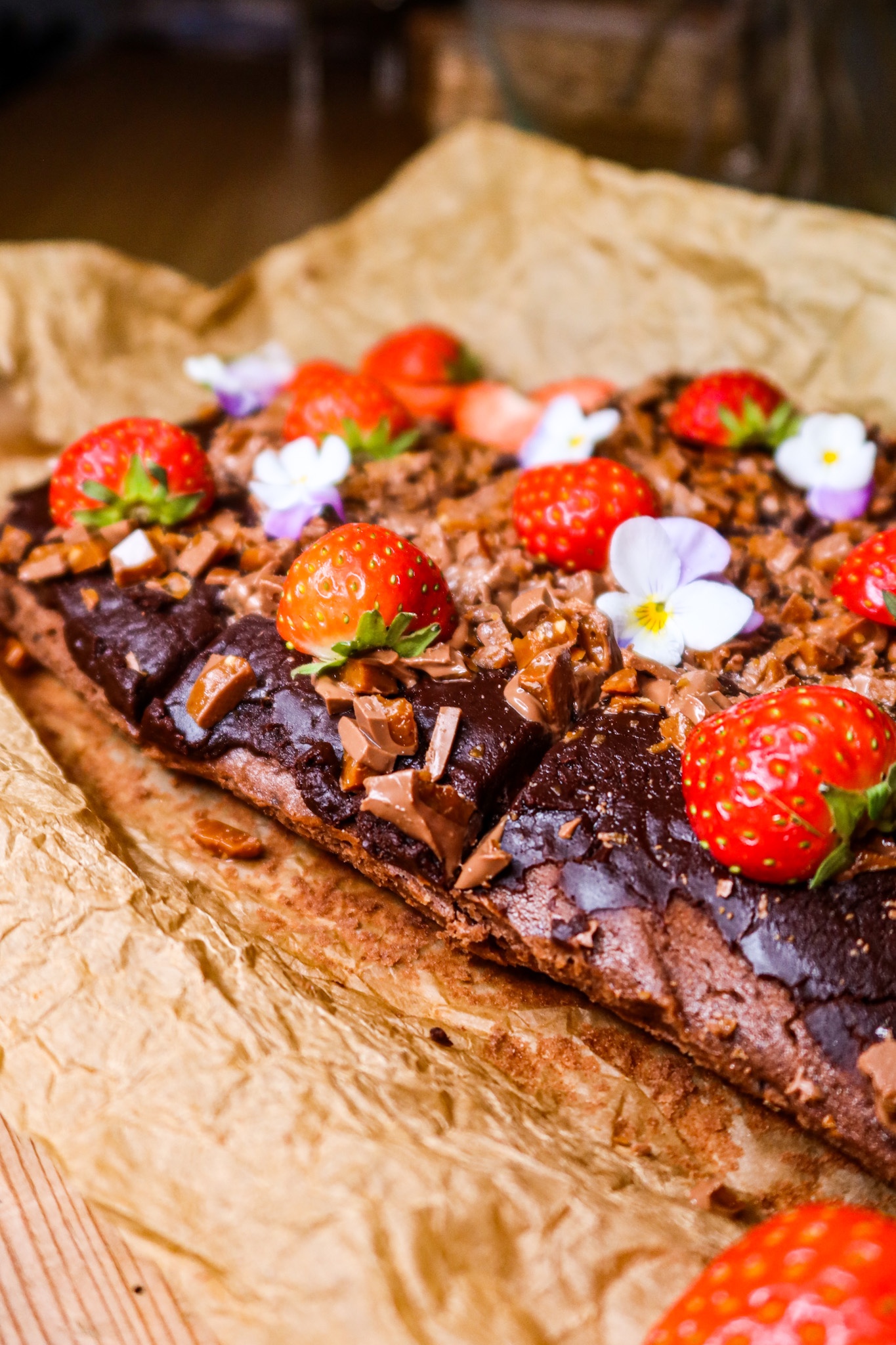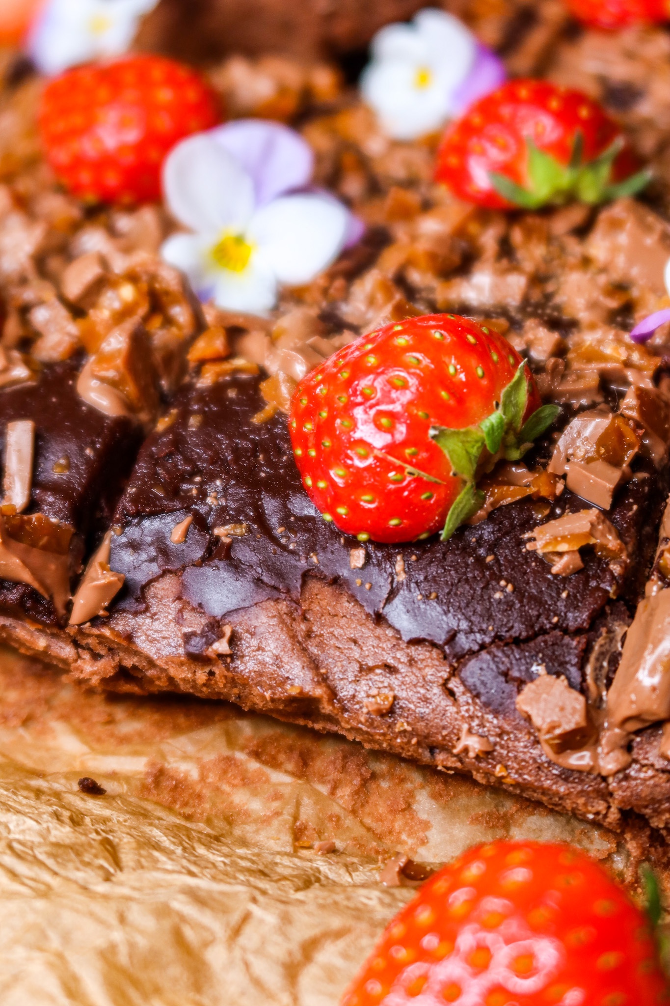 6) Skär upp kakan i bitar och dekorera med hackad dajm, jordgubbar och ätbara blommor. 🍓🌸