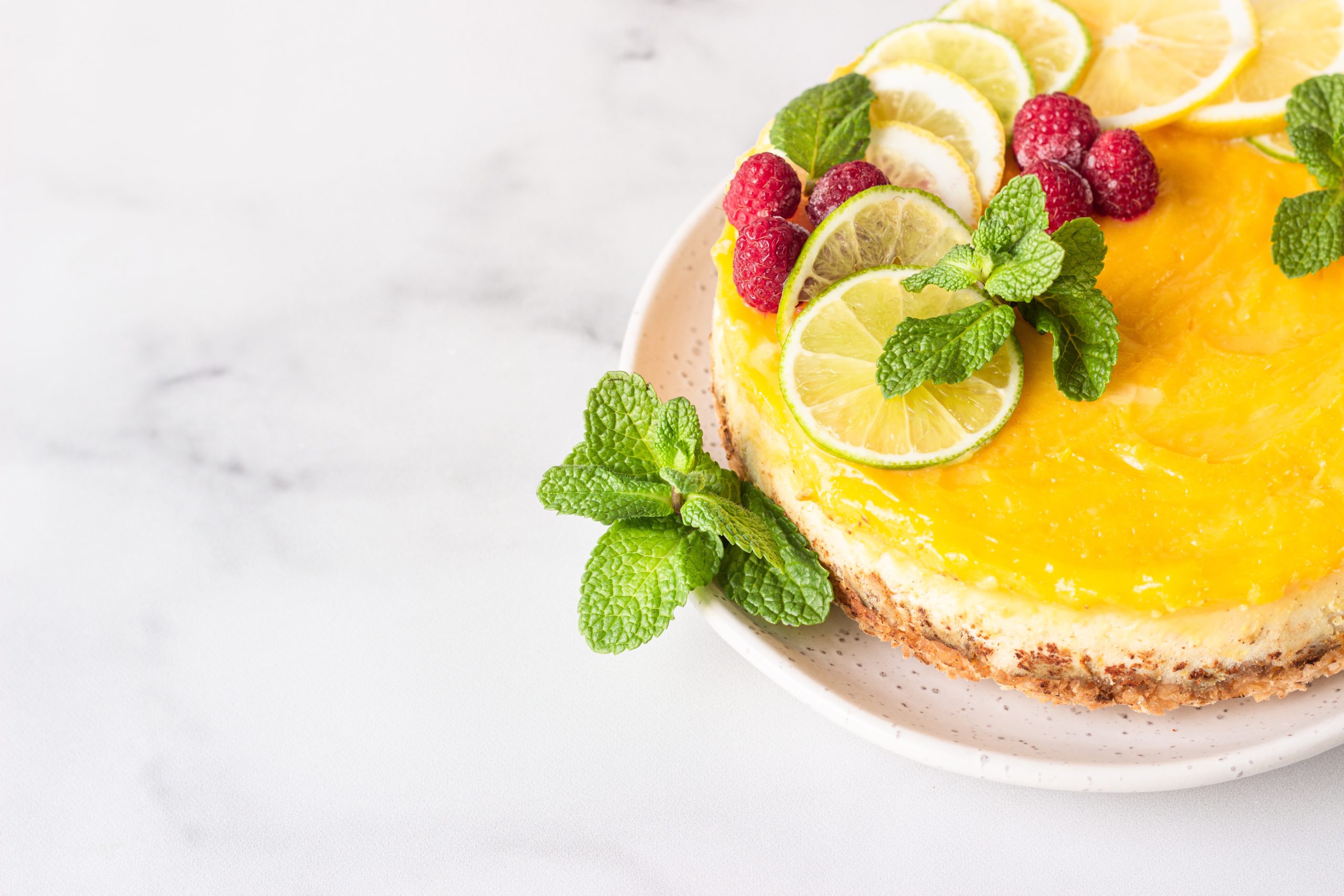 4) Ställ i frysen i ca 4 timmar. Gör lemoncurden om du gör egen. Ta ut cheesecaken efter fyratiden och bre över lemoncurden. Dekorera med hallon, citron/limeskivor och mynta. Låt stå ca 15-20 minuter innan servering.