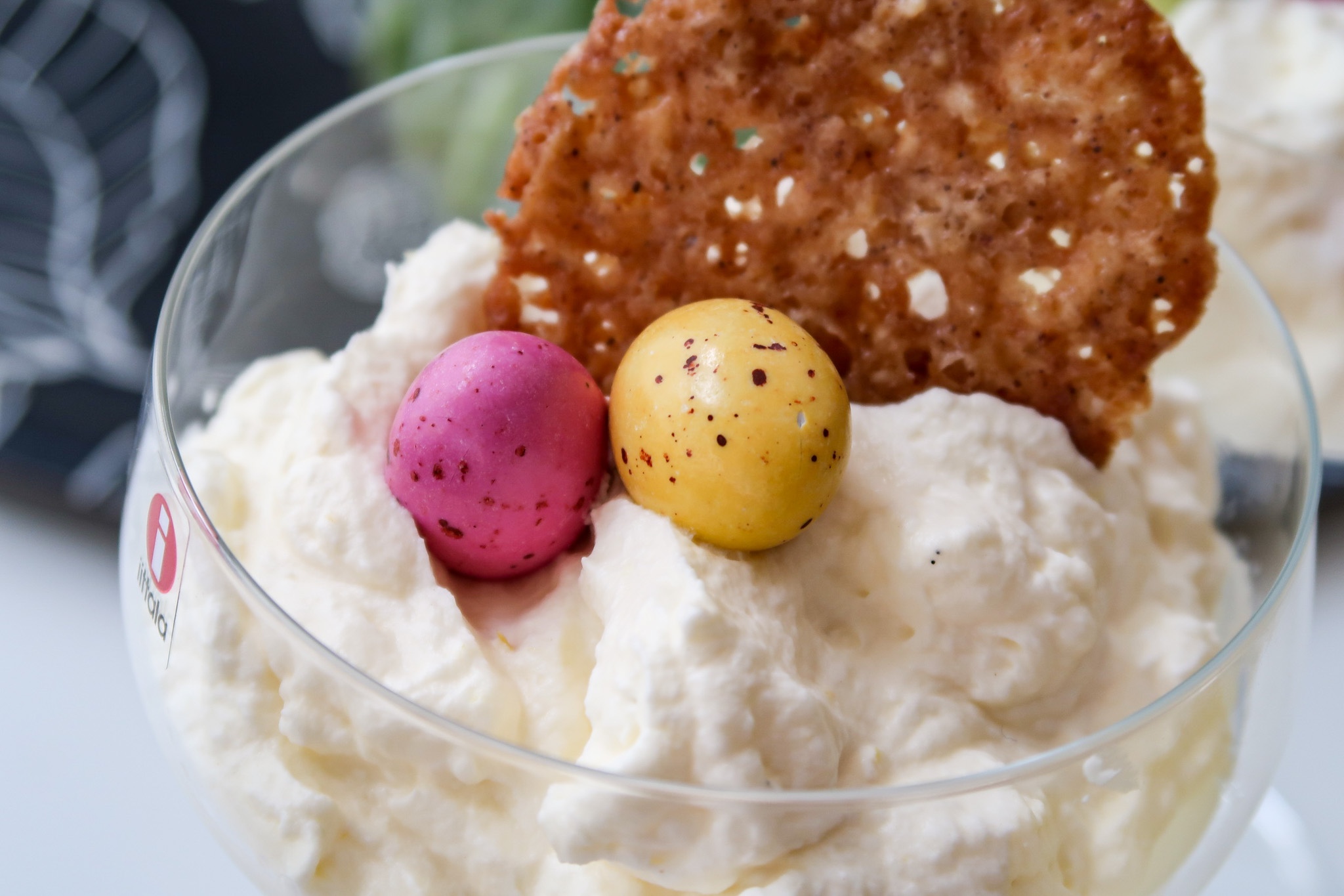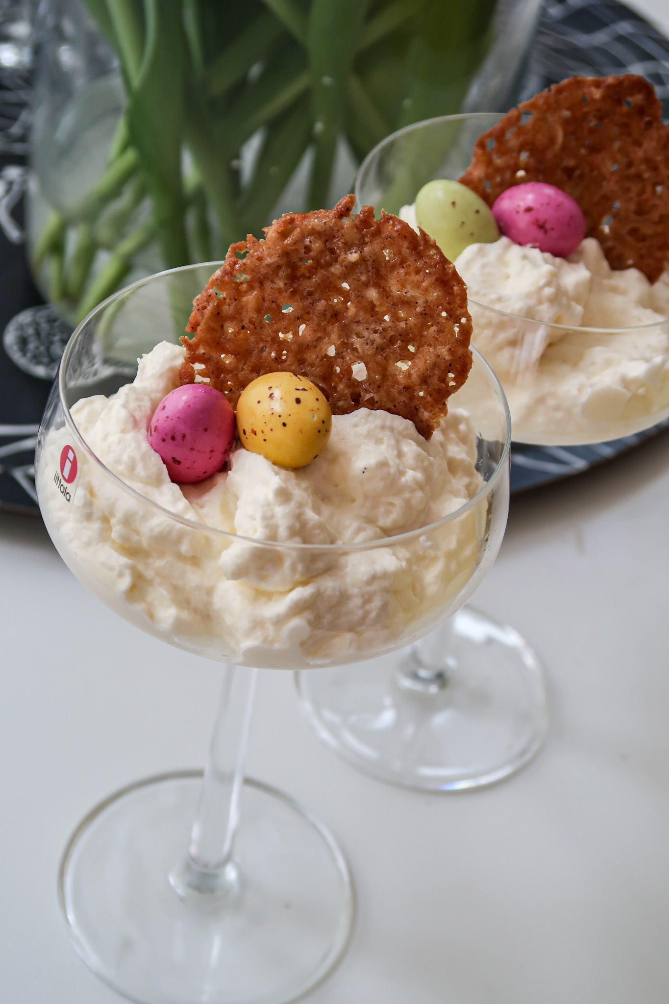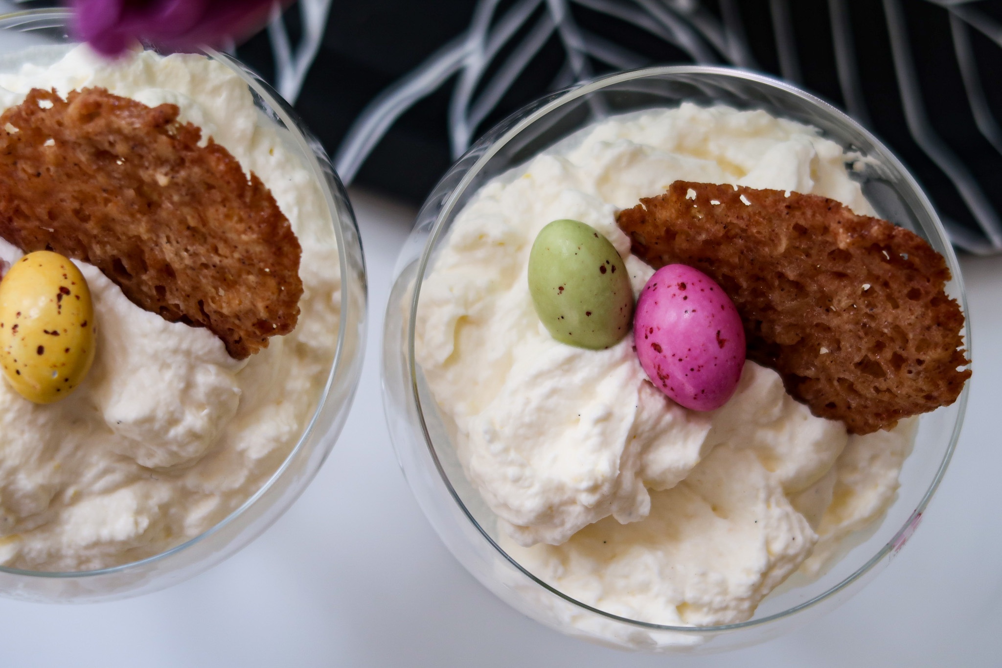 2) Mousse: Häll i grädde, rivet skal av citronen och florsocker i en bunke. Vispa grädden så den blir fluffig. I en annan skål (med rengjorda vispar) vispar du äggvitan så den blir fast (testa genom att hålla skålen upp och ned, det ska inte rinna ut). Blanda i äggvitan samt pressa i saften från citronen och rör om försiktigt så allt blandats ordentligt med en slickepott.