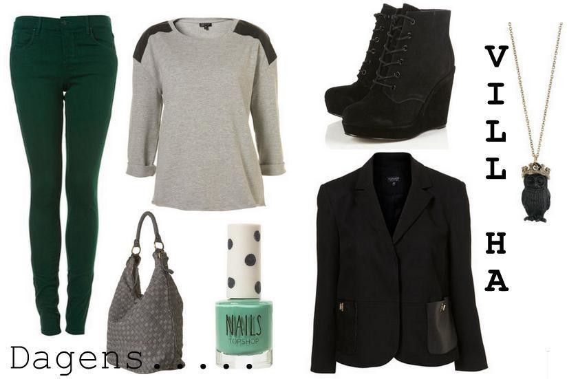 En dag som denna får vara enkel. Ett par gröna jeans (den gröna som är så inne just nu), en skinnprydd tröja och en passande kavaj till det. Varför inte chocka till det hela med lite mintgröna naglar till. Älskar halsbandet! Allt från TOPSHOP!