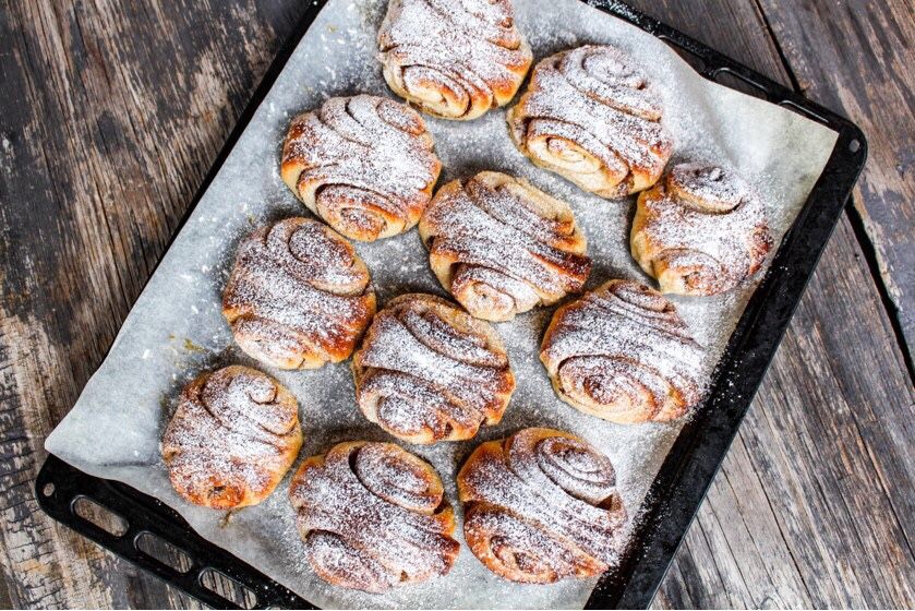 5) Grädda på 225 grader i ca 10 min. Ta ut, låt svalna och pudra florsocker över.