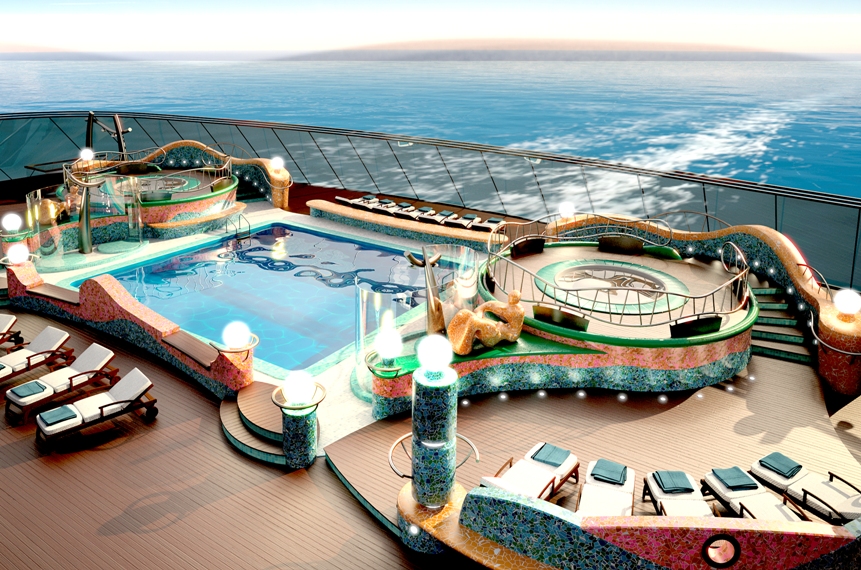 Poolområdena ser ut som om de är tagna ifrån den lyxigaste yachten man sett. Kolla här bara? Är det sant att vi snart ska ligga där och höra skvalpet omkring oss?