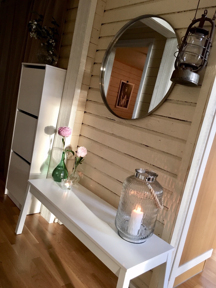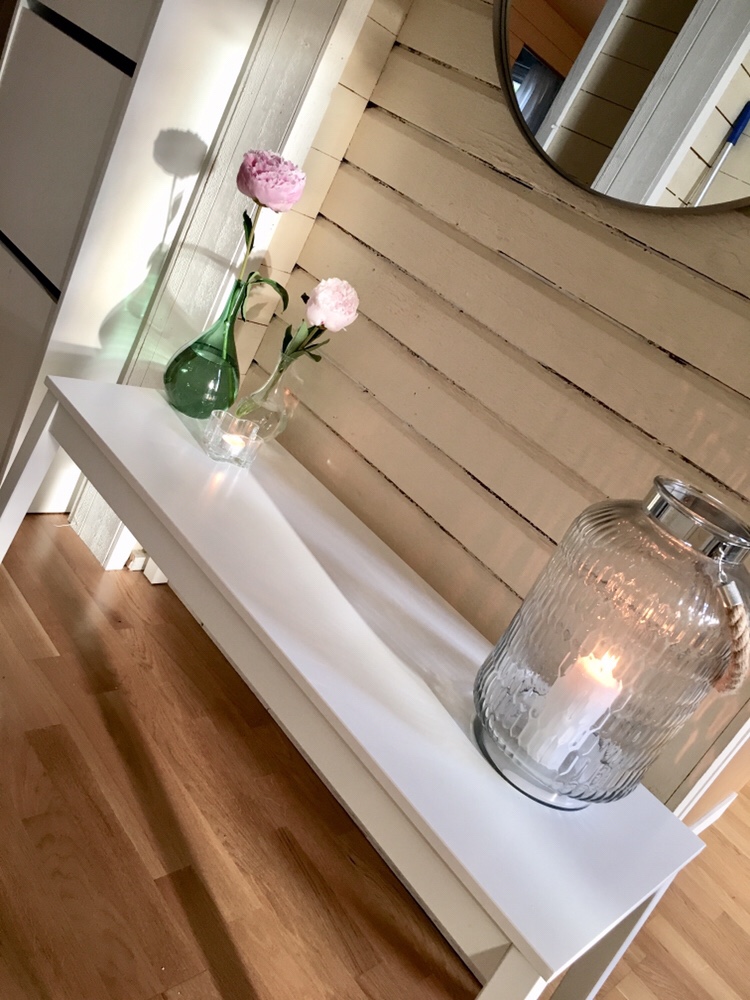 Svängde ihop en liten vägg med spegel och bänk också. Lite köpta bulliga pioner i vaserna också.