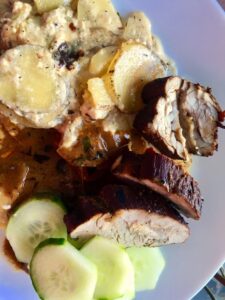 Vi ligger i soffan och har just kollat fotbollen. Vi har ätit helstekt fläskfile med parmesan/potatisgratäng och skysås till.