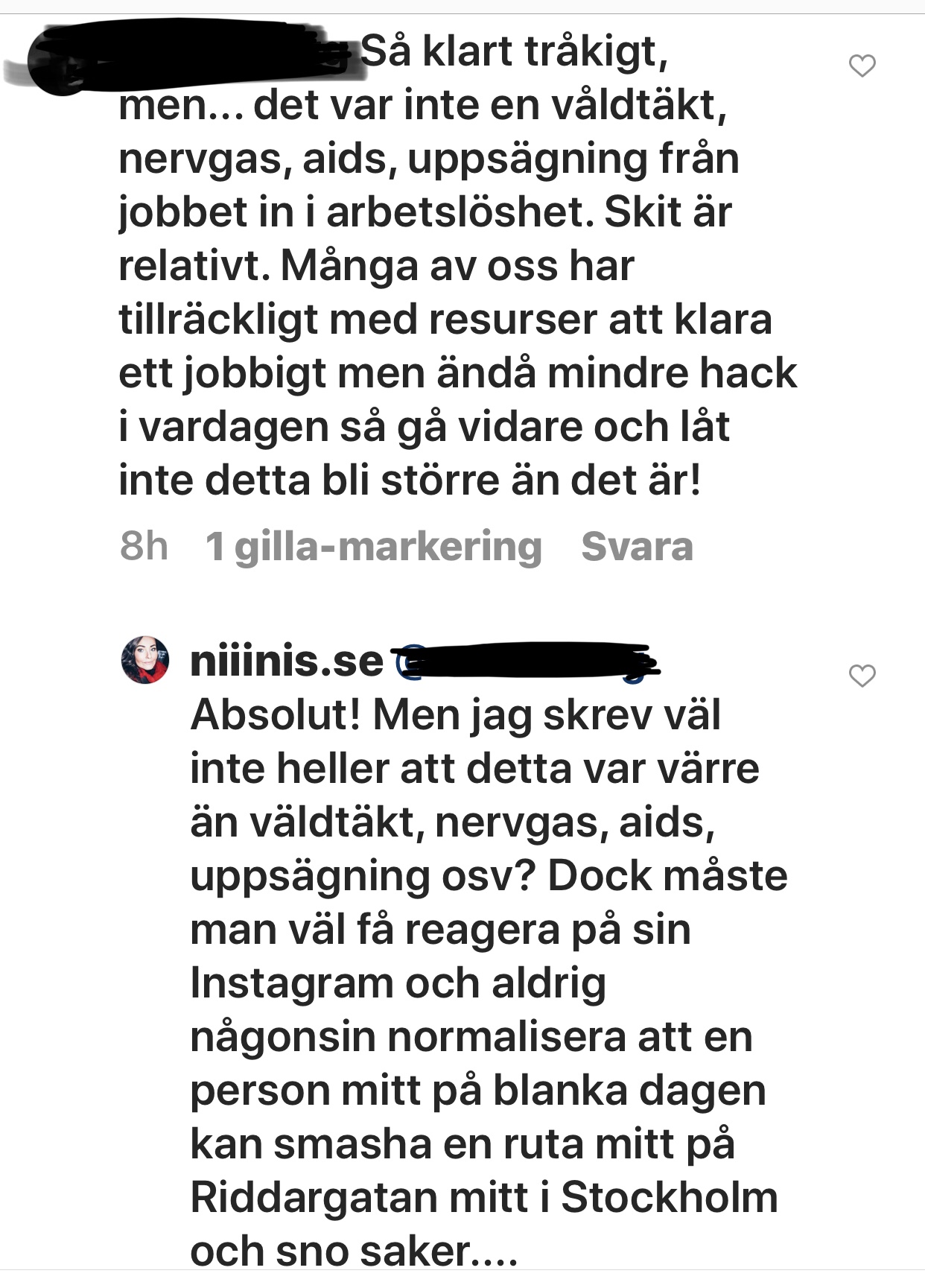 Detta sammanfattar det här dilemmat helt och hållet. Exakt såhär är det! På min Instagram får jag dessutom skriva exakt vad jag vill om mina upplevelser. Annat hade det också varit om jag jämfört det med våldtäkt, nervgas, aids och uppsägning, då hade jag köpt personens åsikt.