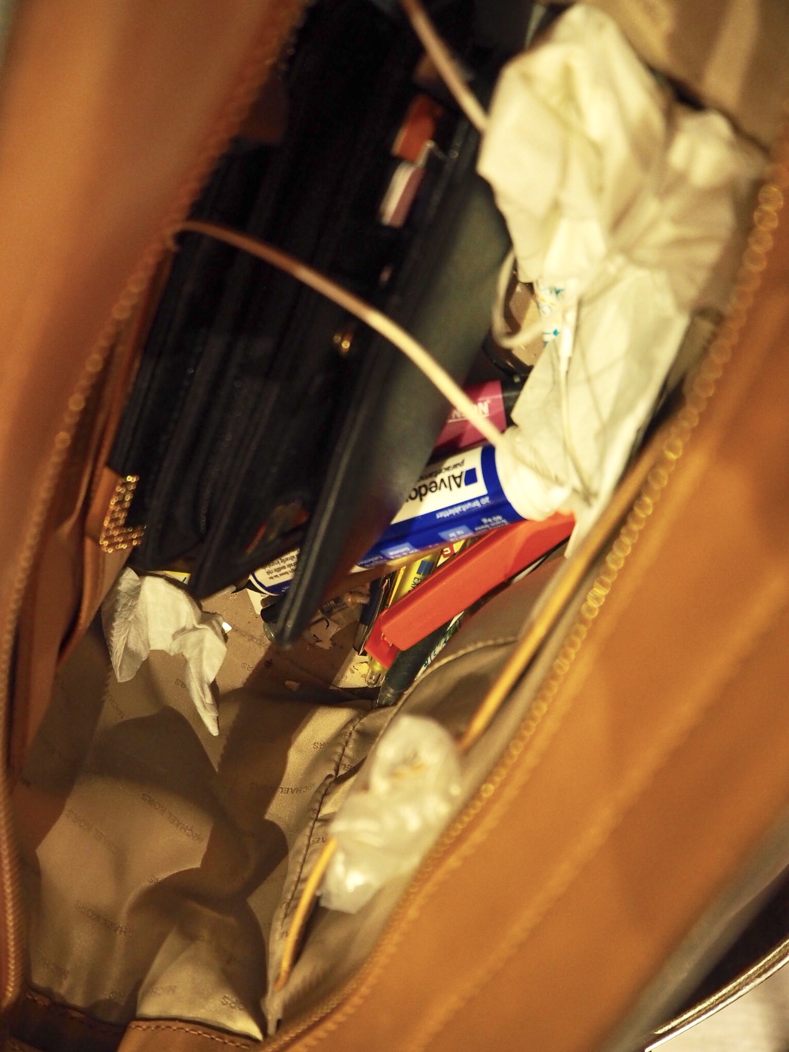 Med en snabb titt i min väska här kan man konstatera att där finns allt från påsklämmor till servetter och alvedon.