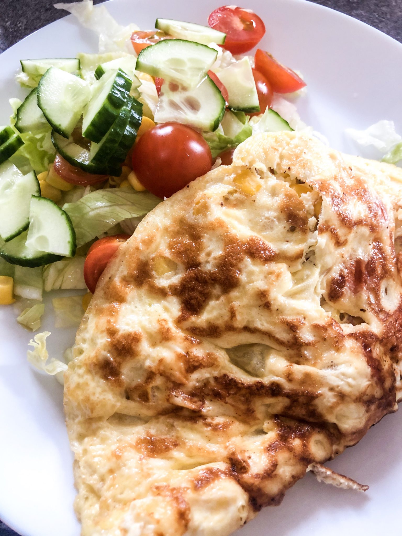 Själv åt jag omelett med fetaost, tomat och lite majs i. Så gott! Mitt bästa tips när du steker omelett och vill ha den hel är att steka på lägre värme och inte röra den alls förrän den är helt klar under. Vår spis går till 9 och jag steker på 5. Du kan kika in lite under omeletten, har den fin färg och du har en stekpanna som släpper fint så kan du swischa runt den genom att kasta upp den i luften.