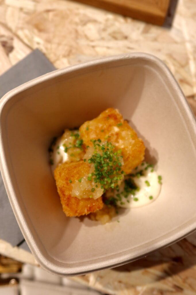 Vi njöt av en rätt i Potatislandet: friterad potatisgratäng med konfiterad silverlök och vitlökscrème, alltså maaaaagiskt gott! Hade kunnat äta 14 friterade fyrkanter till. Mums!
