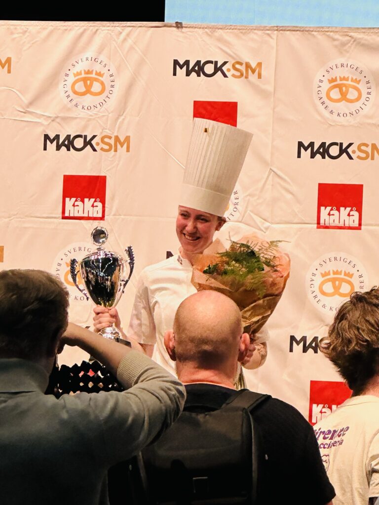 Det första vi såg när vi kom till mässan var att Sanna Olsson, bara 21 år, kammde hem vinsten i Mack-SM 2025! Hennes bidrag, som hon döpt till ”En bit av Öland”, var något alldeles extra…en hyllning till hennes hemtrakter med en oväntad twist. Sanna har nämligen byggt sin macka kring den klassiska öländska kroppkakan, som hon skivar, steker och kombinerar med färskost, rårörda lingon och ärtskott på ett rustikt bröd.
