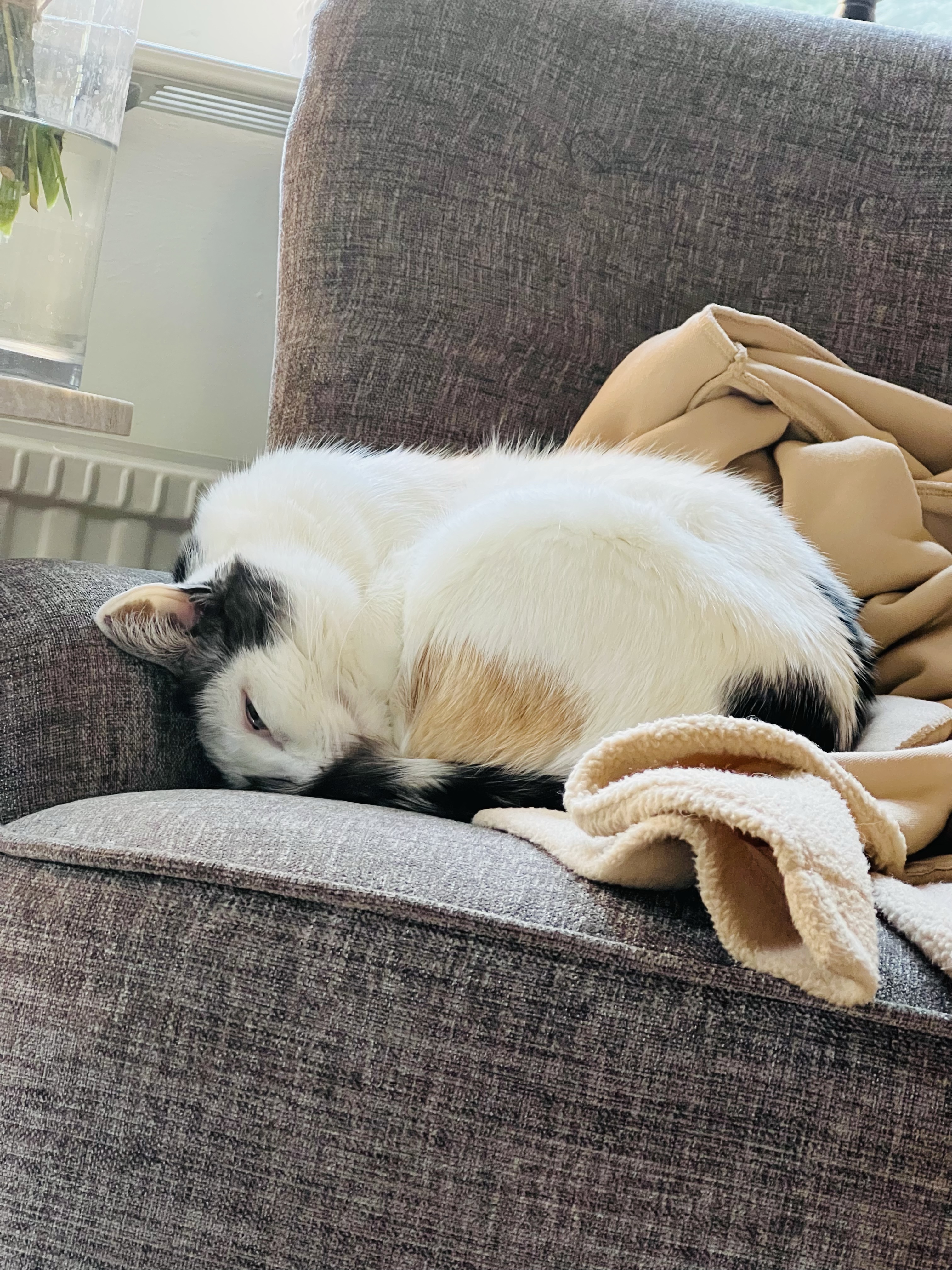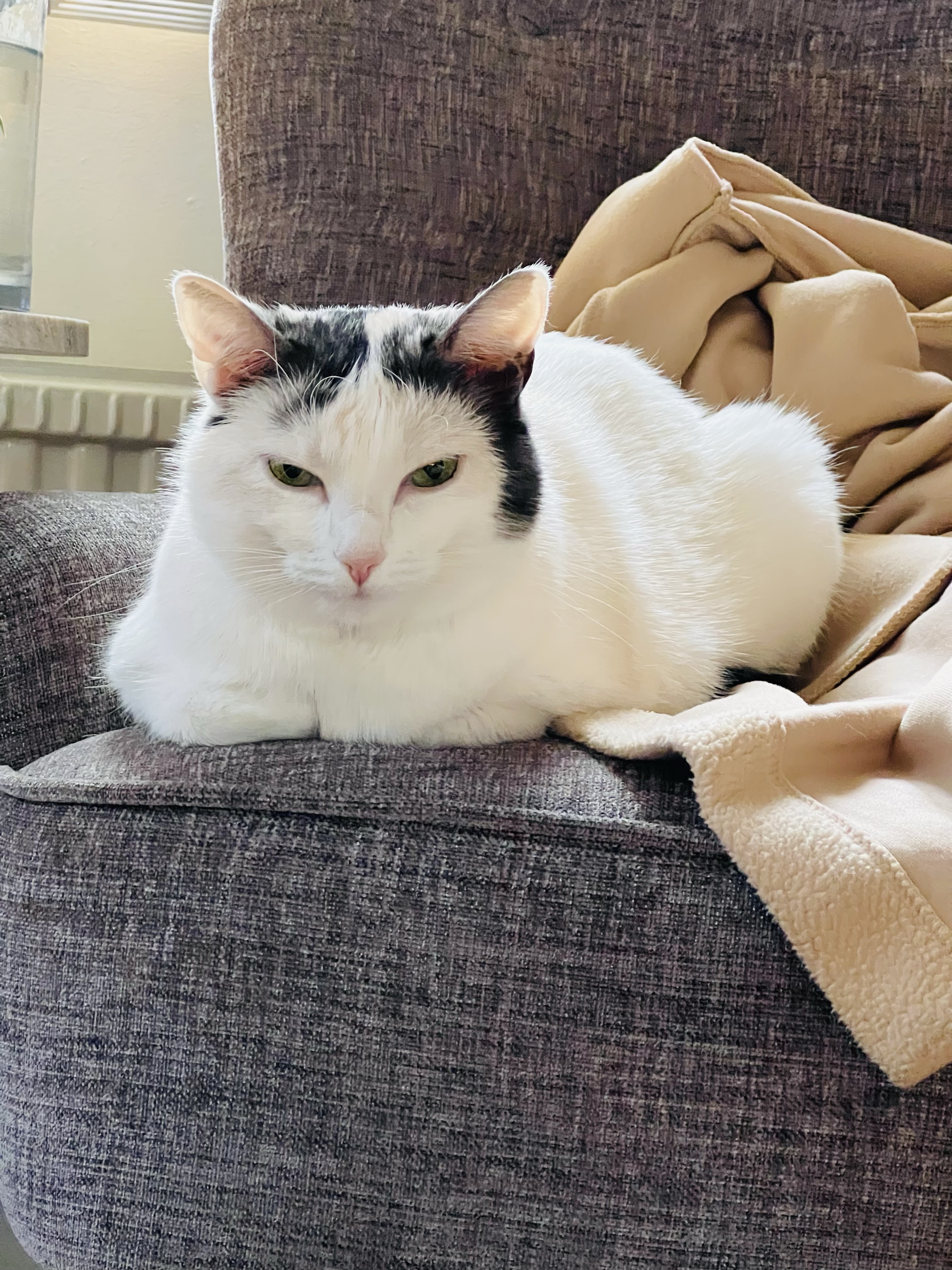 Hon här är med mig hela tiden. Skrev på Instagram i morse om att det känns som hon känner vad jag går igenom. Hon brukar ligga på mig, men nu ligger hon bredvid eller som här i den här fåtöljen. Hon har aldrig legat i den förut, nu sover hon i den då den är närmast mig. Visste att hundar känner på sig men att katter också är så smarta. Varje gång jag rör mig så kikar hon på mig och vad jag gör.