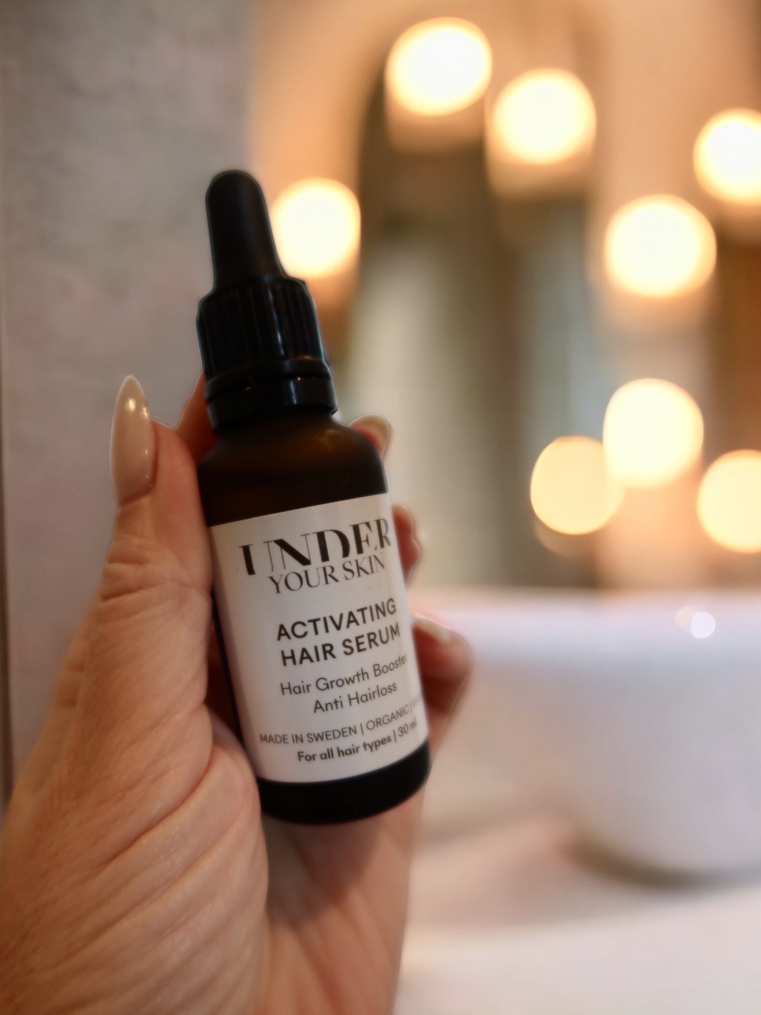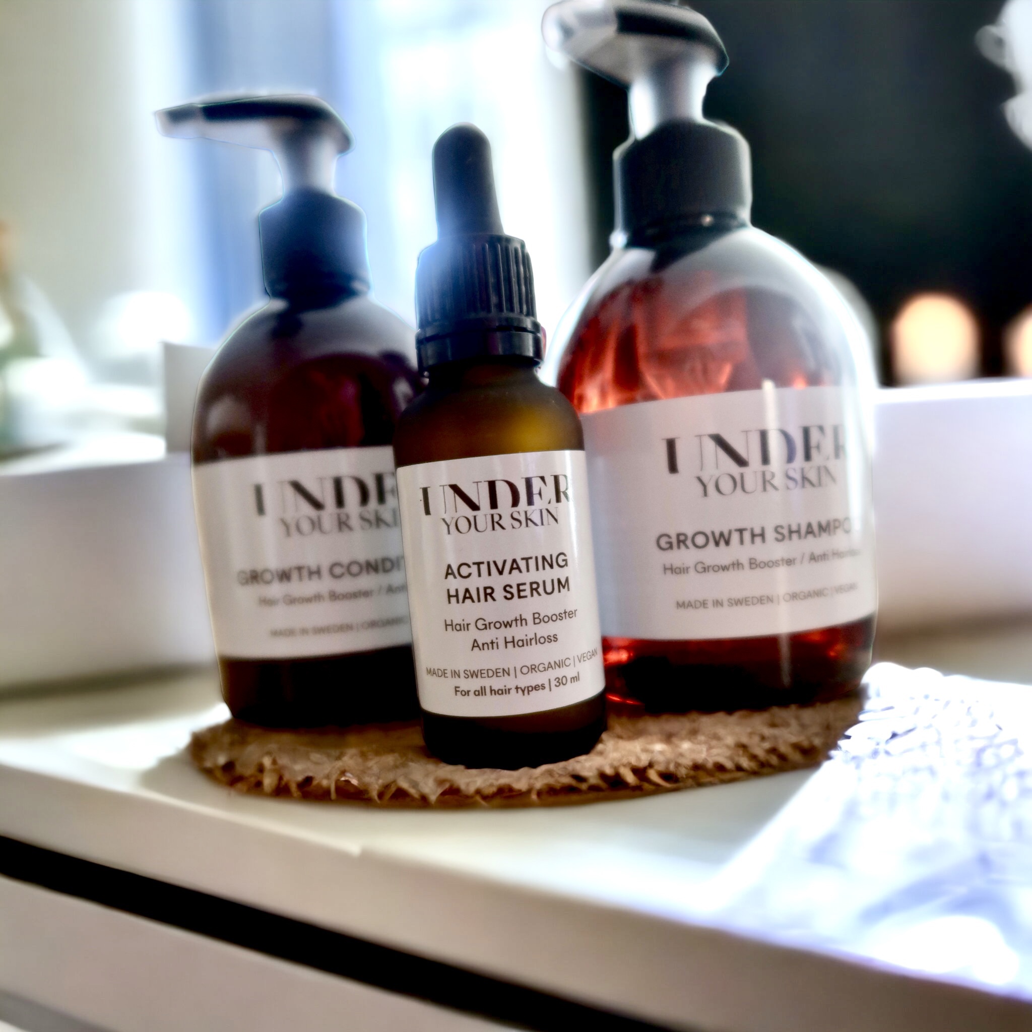 Growth kit – Tonys favorit! Det hittar du HÄR. Han kör den för fullt och tycker att håret känns mycket tjockare. Vikarna börjar fyllas på av nya små hårstrån som växer ut. Dessutom tycker han att håret blir mycket mjukare av det, han bleker ju håret och det blir det ju väldigt torrt av, men inget han märker när han kör med detta kit. Jag var tvungen och sluta med detta kit för mina extensions växte ut alldeles för fort. Haha…. I-landsproblem men så bra funkar det. Använder serumet fortfarande, i mina vikar som jag kallar dem. De där ljusa som gör att det ibland ser ut som man inte har hår där. Under Your Skin har också 150 dagars garanti, är du inte nöjd efter 150 dagar så får du pengarna tillbaka.