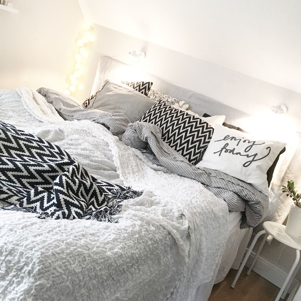 Plädarna och kuddarna som vi har i sängen.
