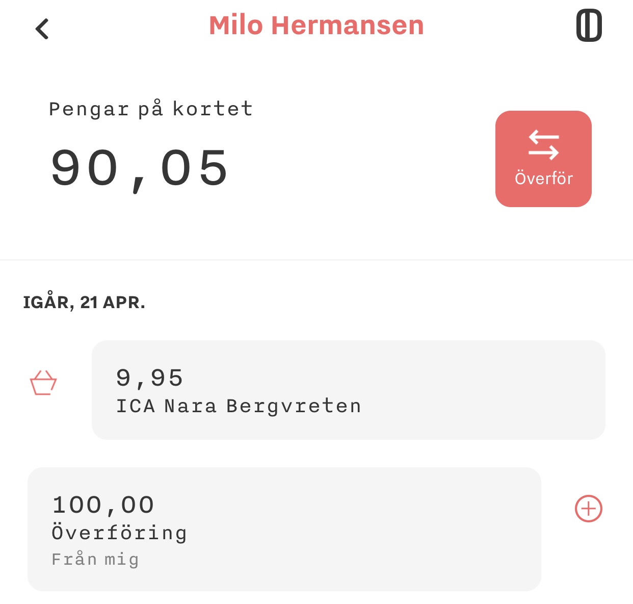 Överföringen från mitt till hans kort tar en millisekund och du sköter det via swish enklast. Ja men hur bra? Jag är svinnöjd!