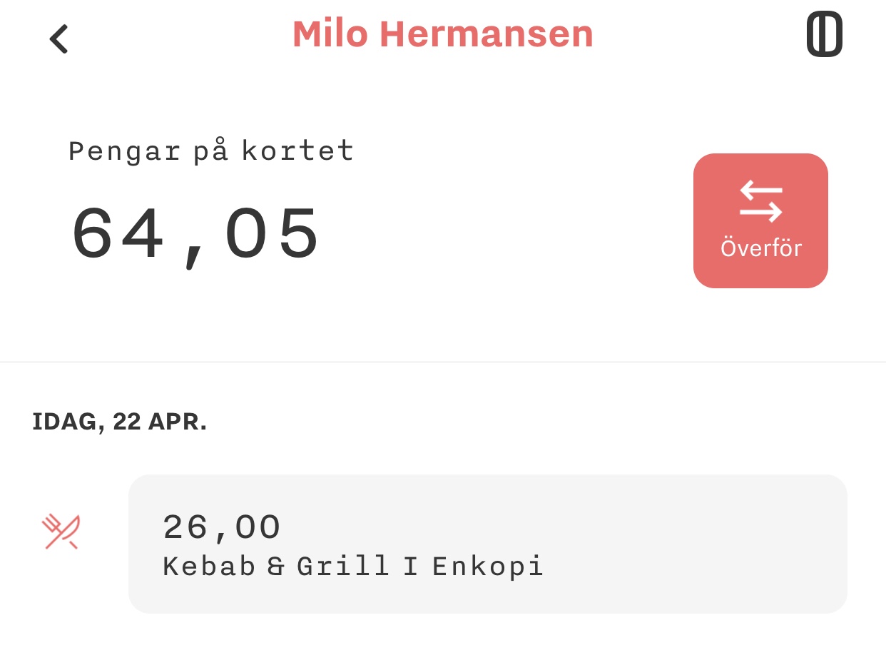 Nu till det som är det absolut bästa med det. Jag har örnkoll på vad som händer med hans kort och hans pengar. Jag själv kan både hantera och se allt som händer på varje kort. Jag får t ex en liten pushnotis om kortet använts och vad det använts till.
