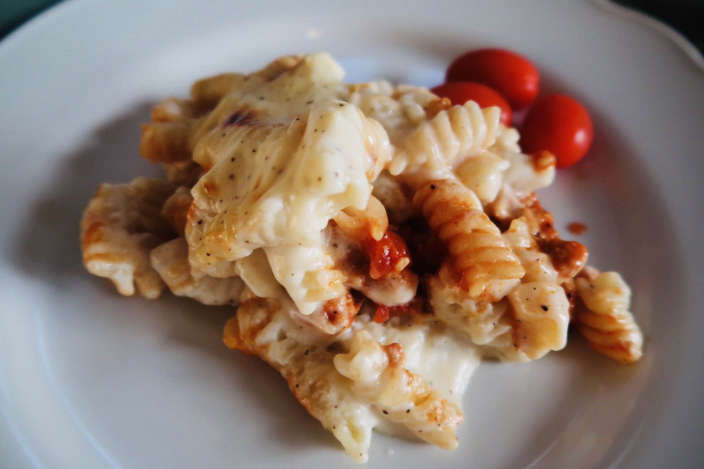 5) Lägg i kycklingröran i botten på en ugnsfast form. Häll över all kokt pasta. Till sist häller du ostsåsen över. Skjuts in i ugnen. 200 grader i ca 20 min eller tills osten början få din färg.