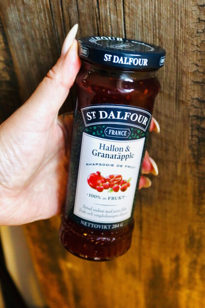 Den här sylten som är uppepå på allt är en alldeles fantastisk sylt med hallon och gratanäpple, hur fin kombo. Känns som en julkombo. Så perfekt!