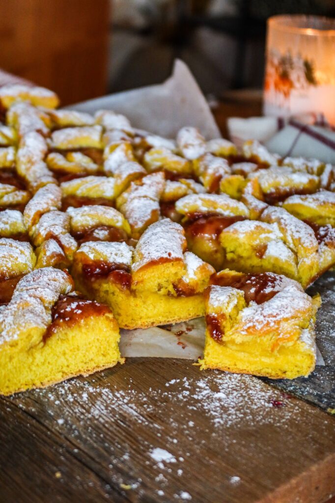 Jag har ju bakat falska wienerbröd tidigare, dock så har jag aldrig testat att göra falska saffranswienerbröd. Den här idén har jag haft ett tag, tänkte att det måste bli perfekt att göra om de vanliga falska wienerbröd till denna variant med saffran. Vet ni vad? Detta var som en fullkomlig dröm faktiskt, känns som man behöver ladda rejält för att orka ta några till kvällsfikat. 😅 Dessa saffranswienerbröd är krämiga av len vaniljkräm på första lagret. Sedan de snirliga med de diagonala över, sen ett lager med så god marmelad som jag tipsar om längre ned. Och sedan gräddas och på med florsocker. Mums!