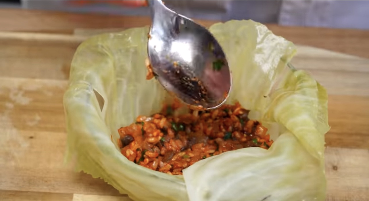 Kolla in detta fantastiska sätt att laga kåldolmar på! Hela kålhuvudet kokas i vatten fylld med mjölk, tar bara 20 minuter så är kålen klar att rivas loss, sen ska det hårda skäras bort på bladen, tyckte det var smart att lägga kålbladet i en skål och sen fylla. Tyckte också att röran som ska vara vara i dolmarna såg såååå himla god ut! Mums!