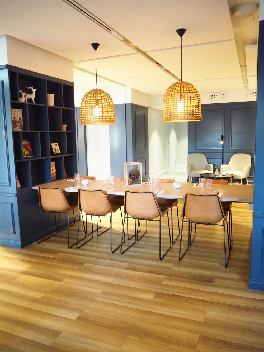 Detta murriga rum med sina blåa väggar smakfullt kombinerade med grönt, senapsgult och guld. Sen blandningen med naturella träslag till…. Sååå snyggt! Jag har förhoppningar om att kunna köra ett event där inom kort. Ska prata med chefen där och se vad hon tycker?