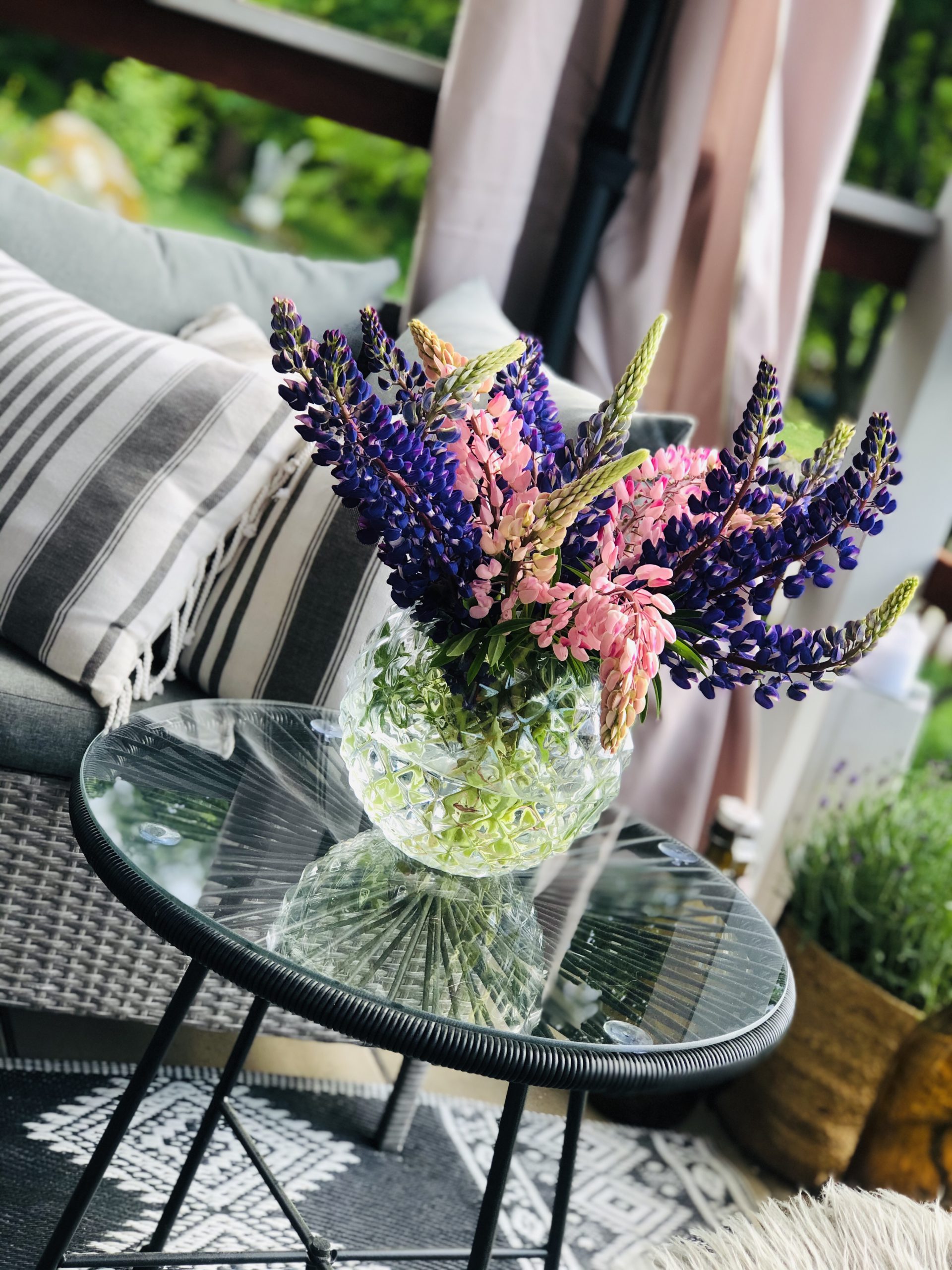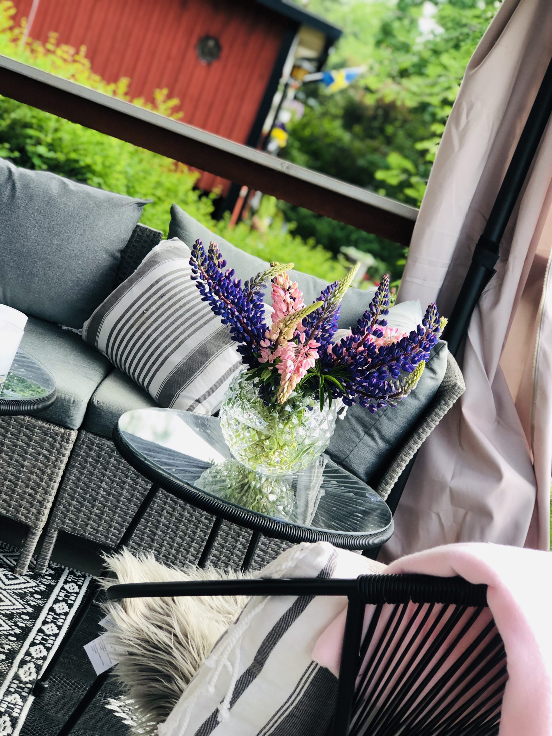 På vägen hem stannade vi till och plockade blommor. Jag ÄLSKAR lupiner och blev så glad när vi hittade ett fält med massor av dom. Väl hemma sedan så började vi duka upp för fika på altanen. Våra föräldrar skulle komma och fira sommarlovet med oss. Jag bakade en tårta efter Milos önskemål helt och hållet och kan säga att den blev en 10 poängare. Du ska få receptet på den senare idag. Så oväntad botten men som blev suuuuperbra!