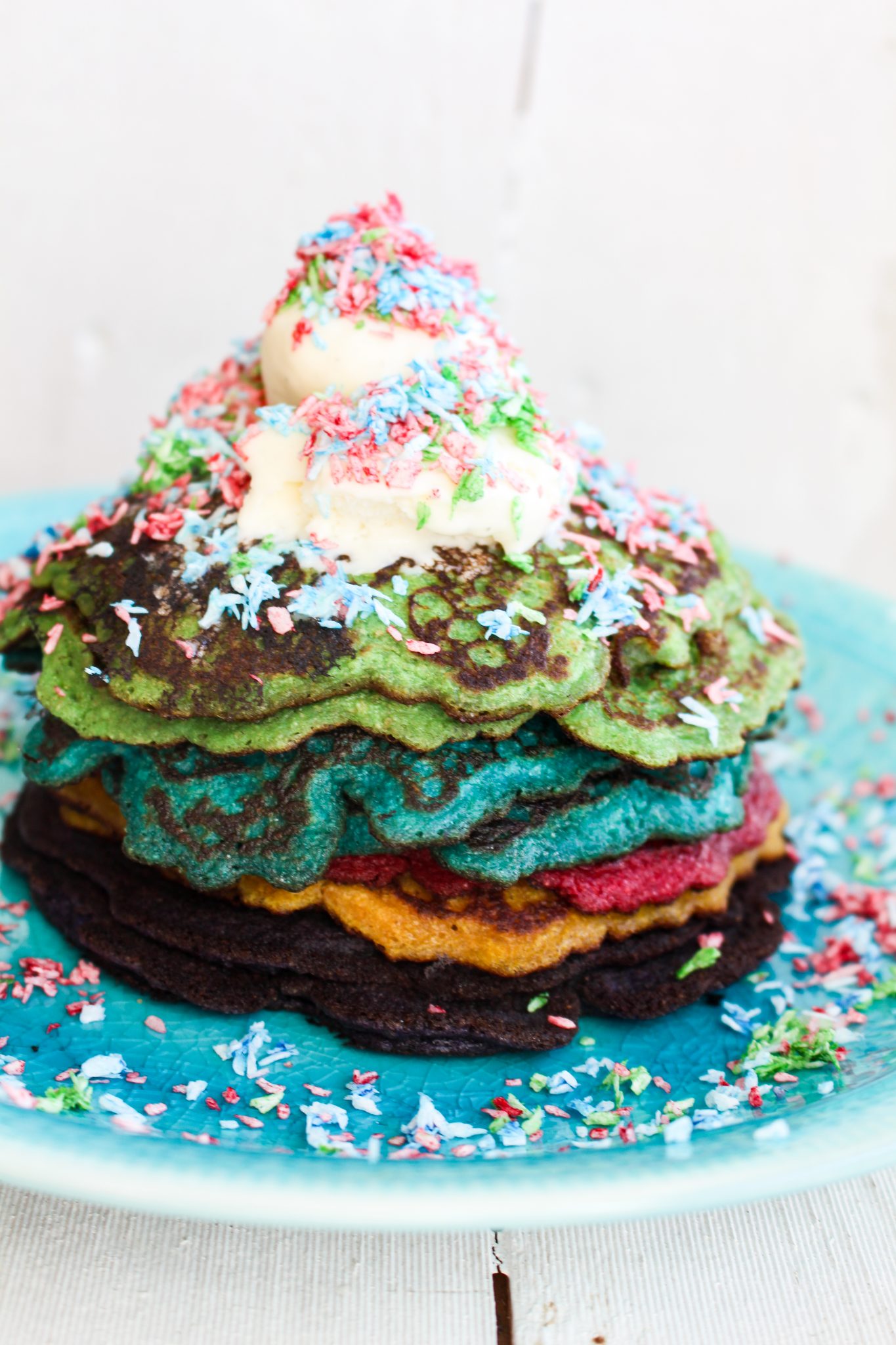 Ja, att baka med färgerna en gång gjorde så Milo ville ha färg i allt. Ja vad tusan, klart vi ska ha färg tänkte jag och brassade amerikanska pannkakor i regnbågens alla färger.