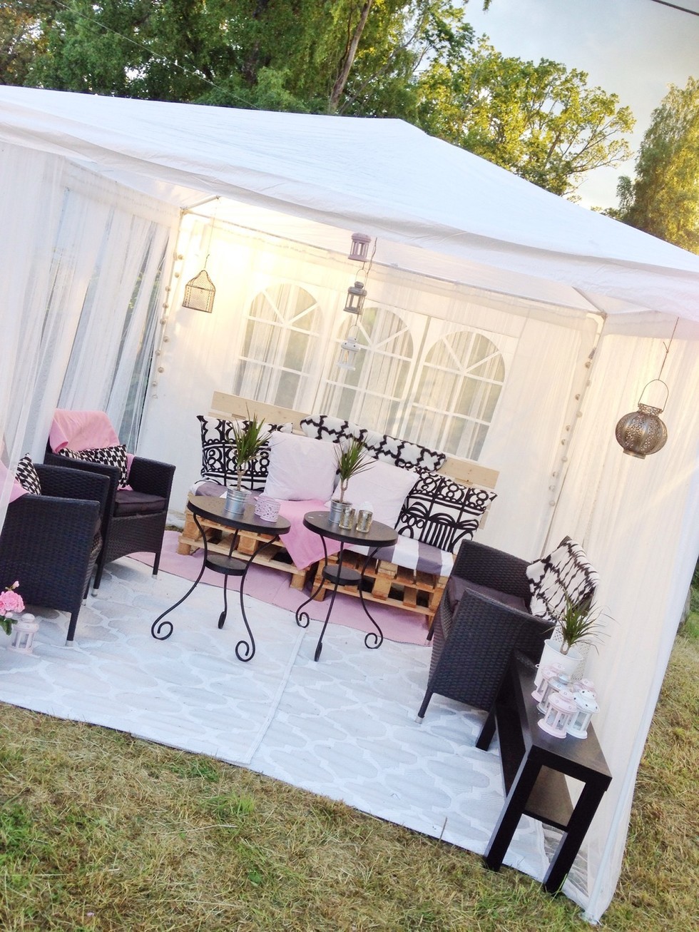 Himmel vad fint det blev! Vår paviljong nyttjas flitigt! I år har vi en lite större och mer rejäl eftersom den förra, billiga från IKEA, blåste sönder totalt. Håller på med pimpningen för fullt här. Nu är det bara mattor kvar. Älskar den där hörnan.