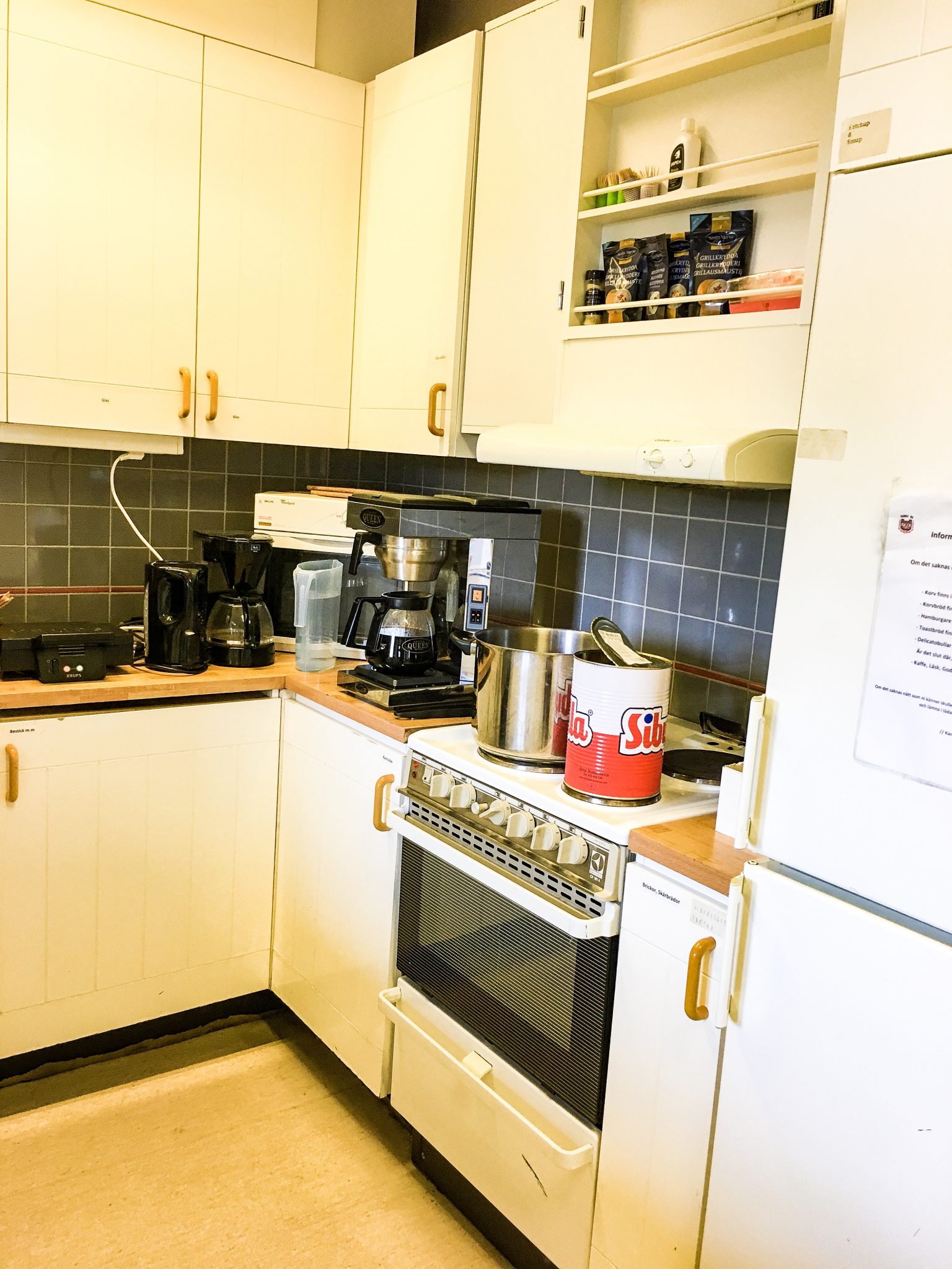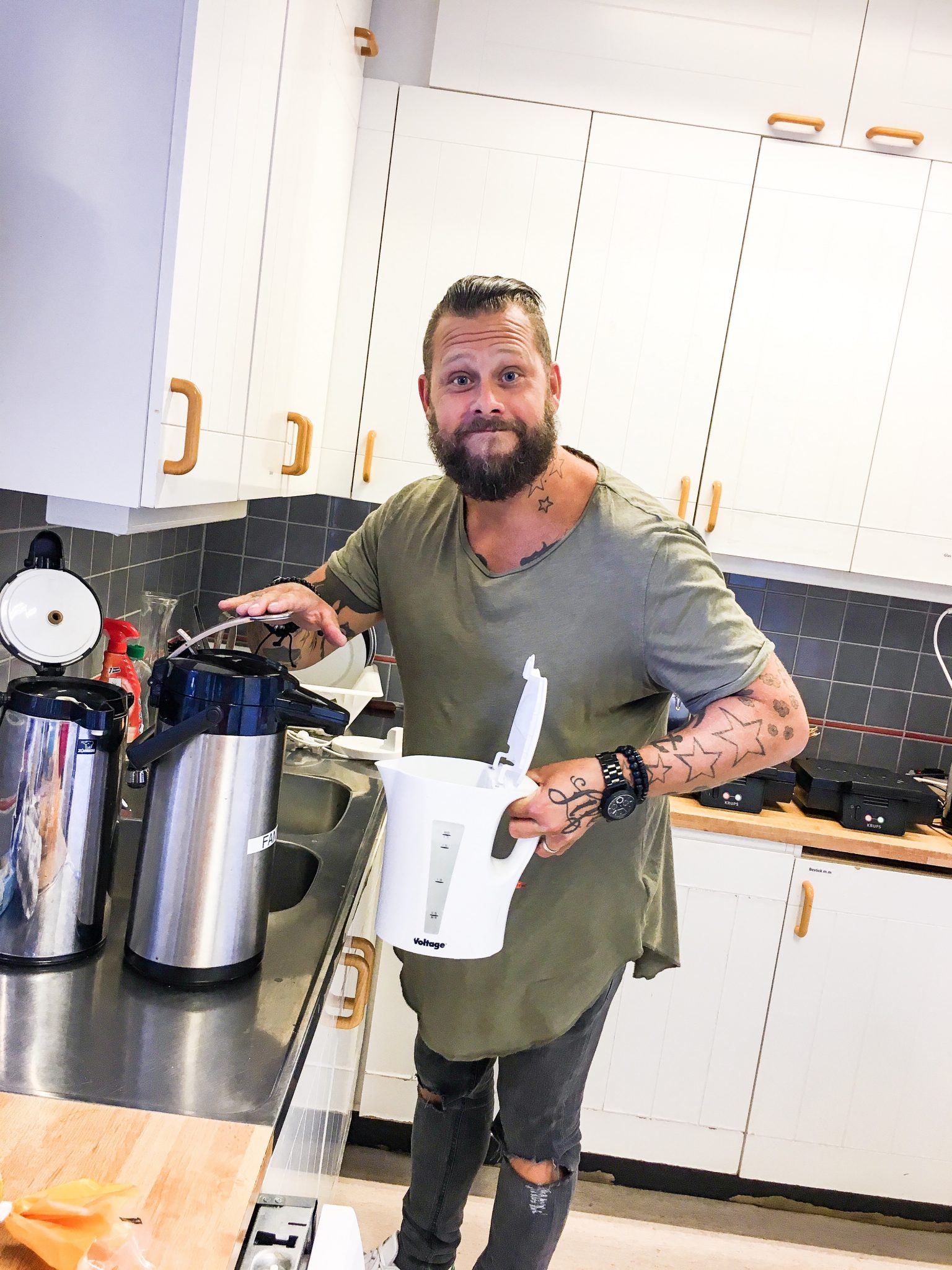 Då brassas det Sibylla korvar och toast i toastmaskinen. Det kokas kaffe för ett helt kompani och så får killarna vara med och hjälpa sina föräldrar. Bra!