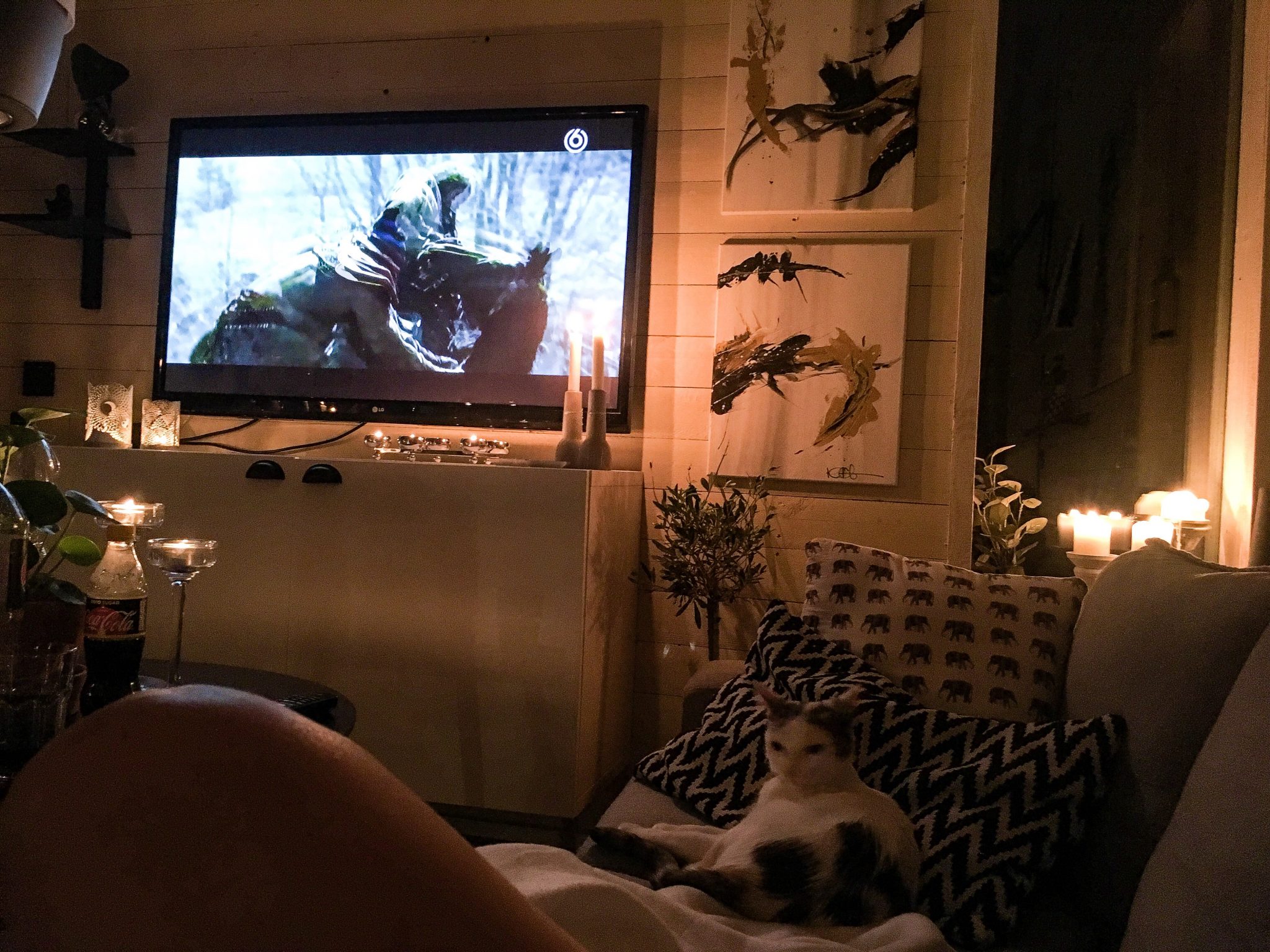 Just nu är det ljusmaraton i vårt hus. Så mysigt att tända upp alla ljus man har och bara njuta av kvällen. Majlis har förflyttat sig nedåt i soffan, jag är för varm tror jag.