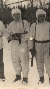 Han till vänster i bilden är min farfar. Han var med i det finska kriget. Jag minns när jag var liten och farfar sov hos oss eller vi hos honom. Då sov han alltid med mössa på sig och jag tyckte det var så festligt konstigt med farfar sådär. Jag skrattade ofta åt hans toppluva. Det roliga var att han hade en Sverigemössa som var blå med gula kungakronor på och en stor gul tofs. När jag sedan växte upp och fick veta att det hade en anledning var det såklart inte lika festligt!